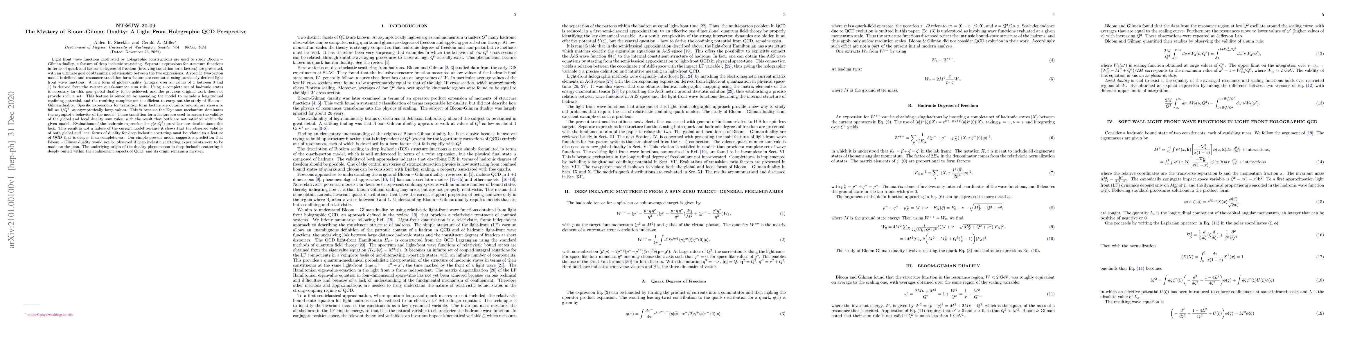 Light front wave functions motivated by holographic constructions are used to study Bloom-Gilman duality of deep inelastic scattering. Separate expressions for structure functions in terms of quark and hadronic degrees of freedom are presented, with a goal of relating the two expressions. A two-parton model is defined and resonance transition form factors are computed using previously derived light front wave functions. A new form of global duality is derived from the valence quark-number sum rule. Using a complete set of hadronic states is necessary for this new global duality to be achieved. Previous original work does not provide such a set. This is remedied by amending the model to include a longitudinal confining potential, and the resulting complete set is sufficient to carry out the study of Bloom-Gilman duality. Expressions for transition form factors are obtained and all are shown to fall asymptotically as 1/Q2. The Feynman mechanism dominates the asymptotic behavior of the model. These transition form factors are used to assess the validity of the global and local duality sum rules, with the result that both neither are satisfied. Evaluations of the hadronic expression for q(x,Q2) provide more details about this lack. This result shows that the observed validity of both global and local forms of duality for deep inelastic scattering must be related to a feature of QCD that is deeper than completeness. Our simple present model suggests a prediction that Bloom-Gilman duality would not be observed if deep inelastic scattering experiments were to be made on the pion. The underlying origin of the duality phenomenon in deep inelastic scattering is deeply buried within the confinement aspects of QCD, and remains a mystery.