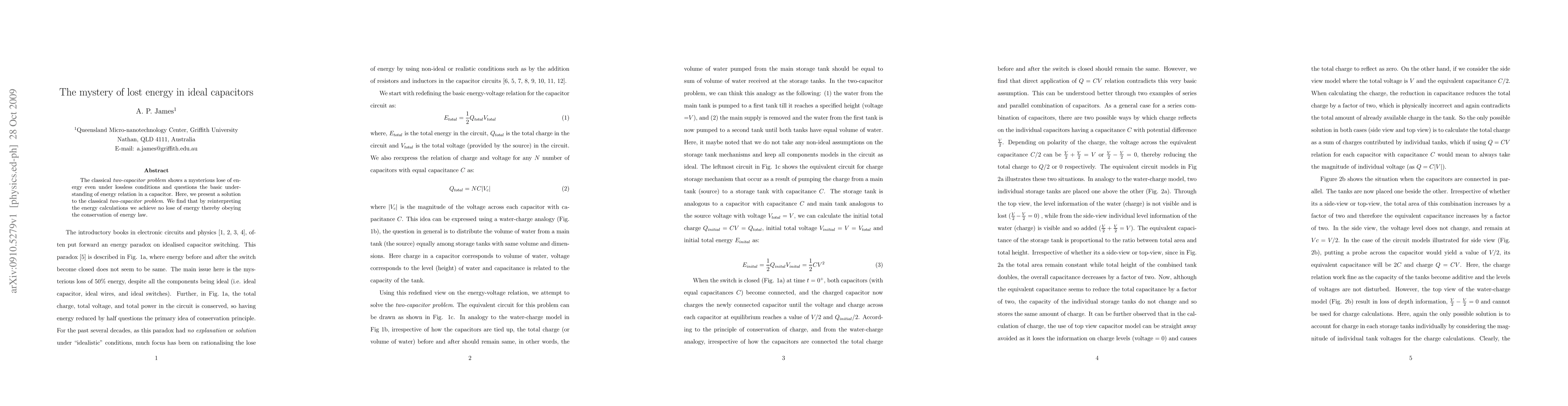 The classical two-capacitor problem shows a mysterious lose of energy even under lossless conditions and questions the basic understanding of energy relation in a capacitor. Here, we present a solution to the classical two-capacitor problem. We find that by reinterpreting the energy calculations we achieve no lose of energy thereby obeying the conservation of energy law.