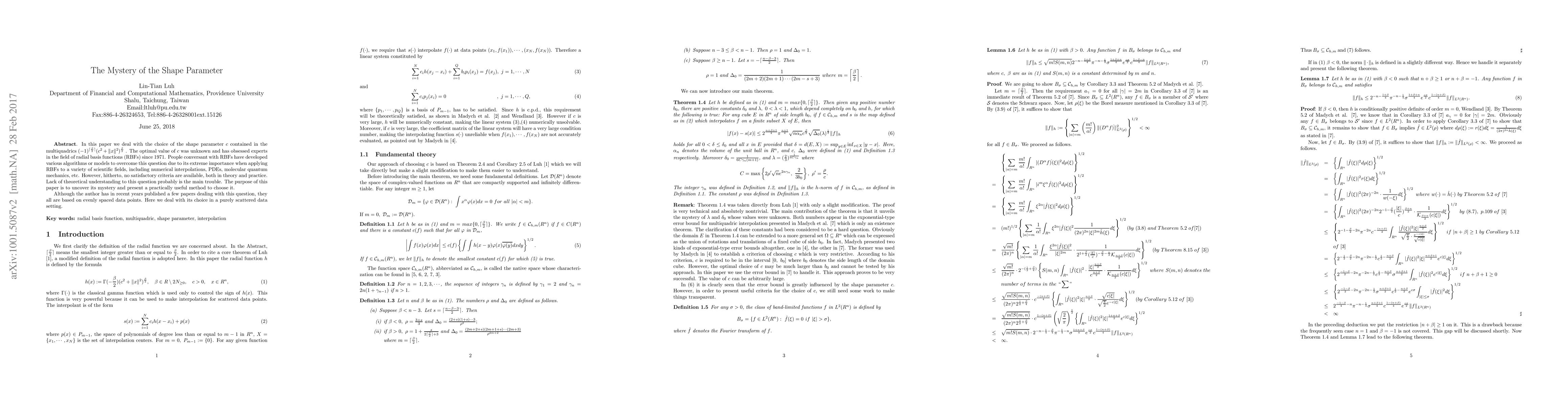In this paper we present criteria for the optimal choice of the shape parameter c contained in the famous radial function multiquadrics.