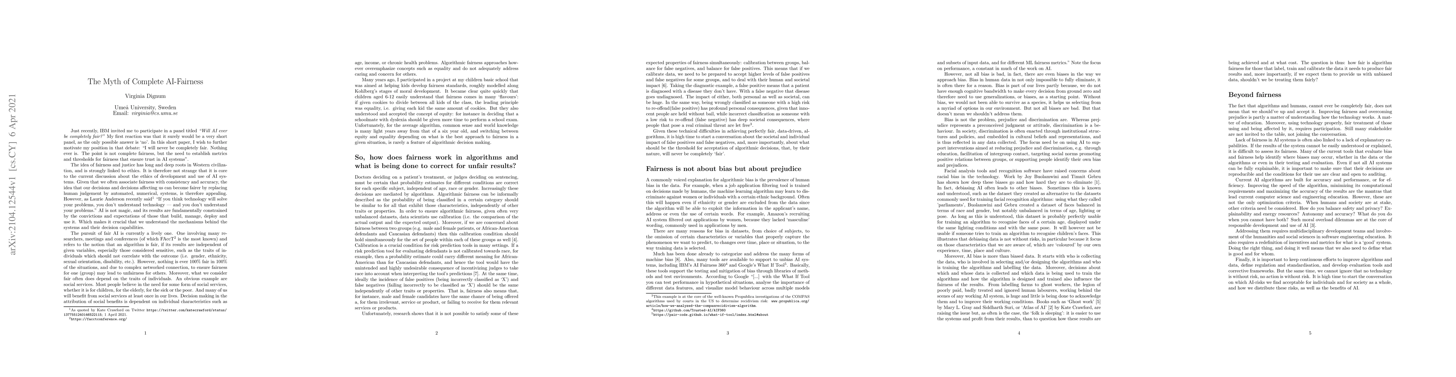 The idea of fairness and justice has long and deep roots in Western civilization, and is strongly linked to ethics. It is therefore not strange that it is core to the current discussion about the ethics of development and use of AI systems. In this short paper, I wish to further motivate my position in this matter: ``I will never be completely fair. Nothing ever is. The point is not complete fairness, but the need to establish metrics and thresholds for fairness that ensure trust in AI systems".