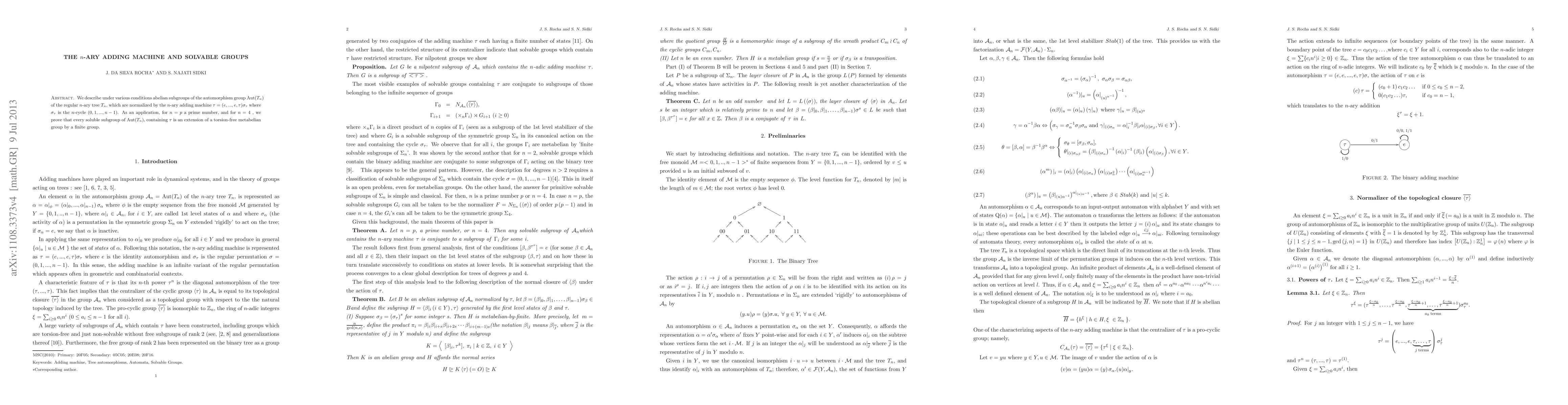 We describe under a variety of conditions abelian subgroups of the automorphism group A of the regular n-ary tree T which are normalized by the n-ary adding machine t=(e,...,e,t)s where s is the n-cycle (0,1,...,n-1). As an application, for n a prime number, and for n = 4 we prove that every soluble subgroup of A containing t is an extension of a torsion-free metabelian group by a finite group.