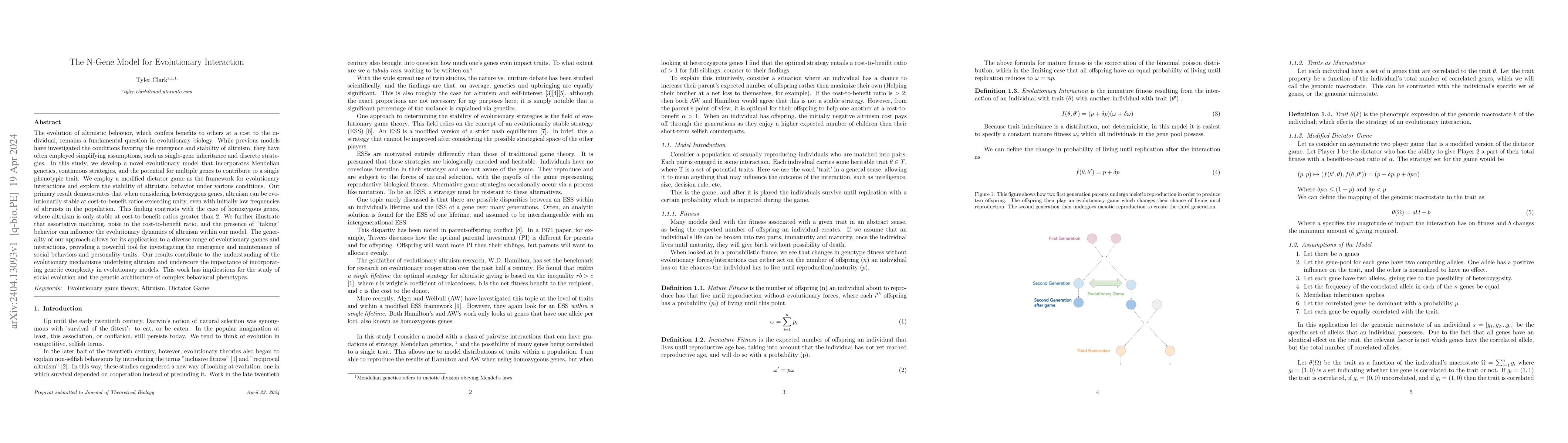 This paper introduces the N-Gene Model for evolutionary games, exploring altruism's stability with multiple genes and continuous strategies. It finds that altruism can be evolutionarily stable under heterozygous genes even when cost-to-benefit ratios exceed one, contrasting with homozygous gene scenarios where ratios must exceed two.