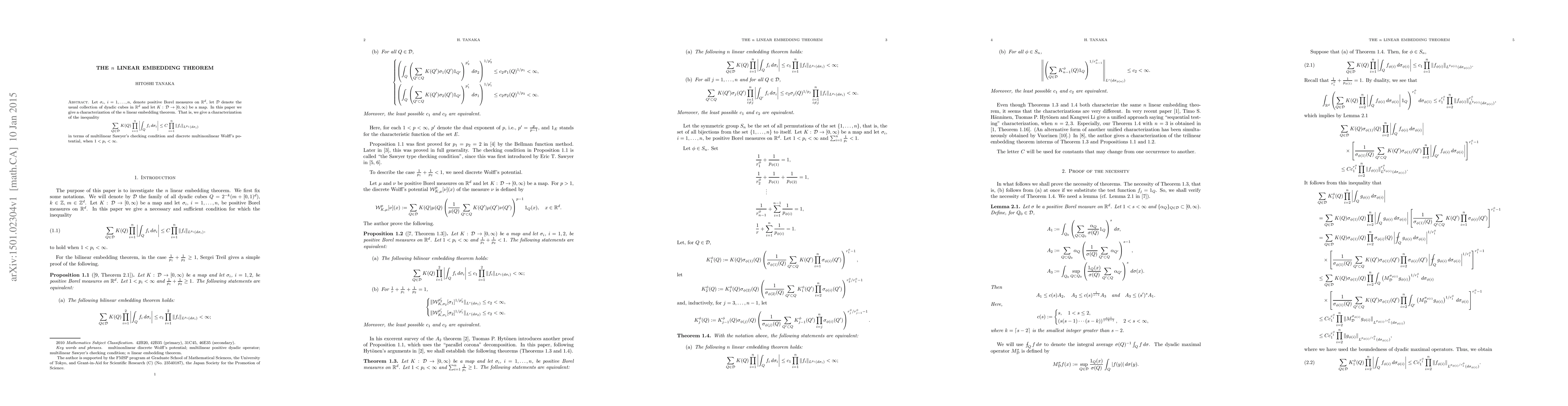 The paper provides a characterization of the $n$ linear embedding theorem, linking it to multilinear Sawyer's checking condition and discrete multinonlinear Wolff's potential, with implications for inequalities involving Borel measures and function norms.