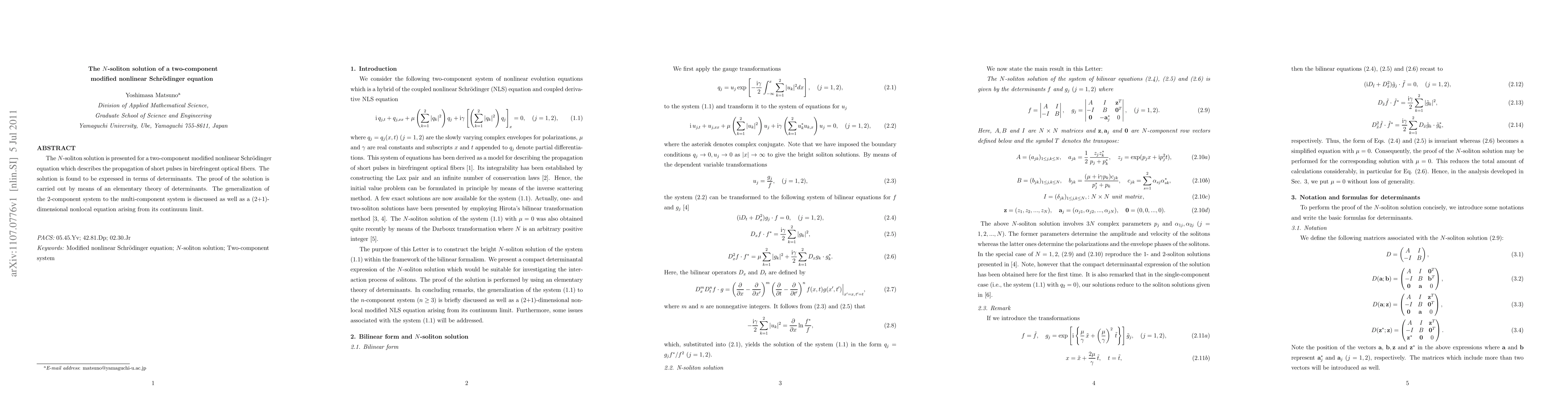 This paper presents an $N$-soliton solution for a two-component modified nonlinear Schrödinger equation, describing pulse propagation in birefringent optical fibers, expressed via determinants. The solution's validity is proven using determinant theory, and the paper also explores generalizations to multi-component systems and related nonlocal equations.