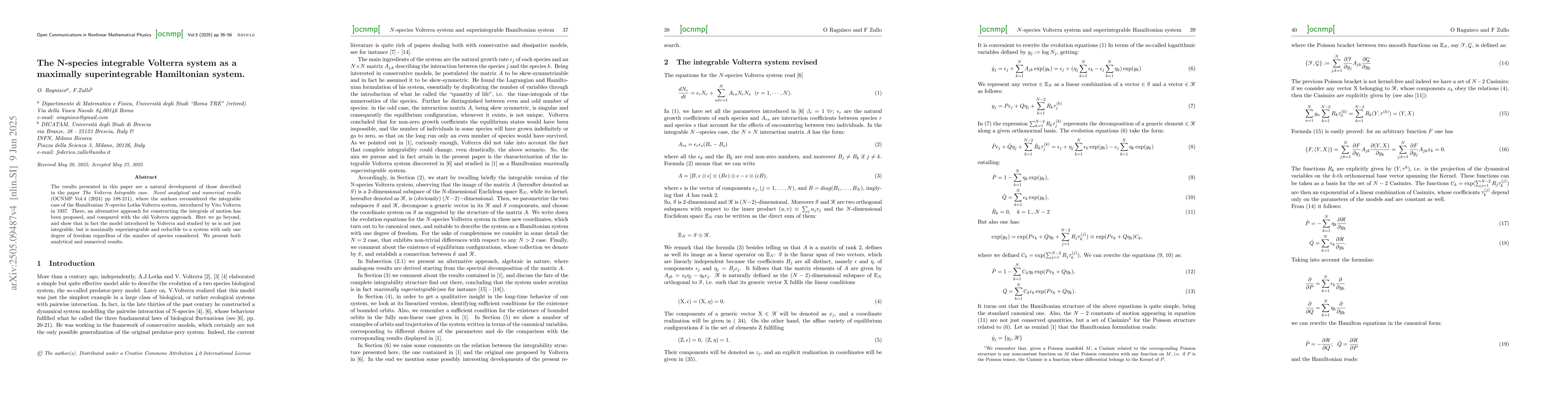 The paper's main technical contribution is demonstrating the maximally superintegrable property of the N-species Volterra system and reducing it to a system with one degree of freedom, presenting both analytical and numerical evidence.