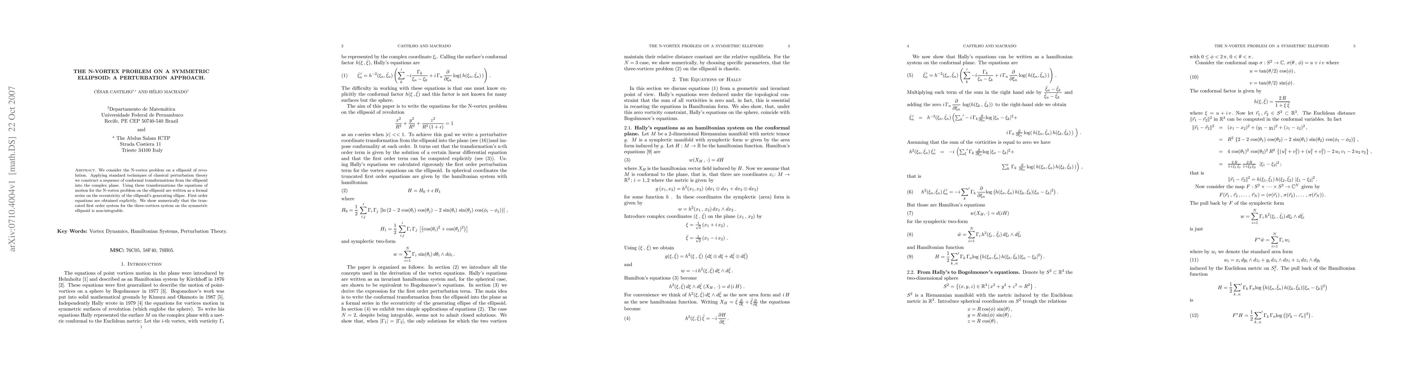 Researchers use perturbation theory to study the N-vortex problem on a symmetric ellipsoid, finding that the truncated first-order system for three vortices is non-integrable.