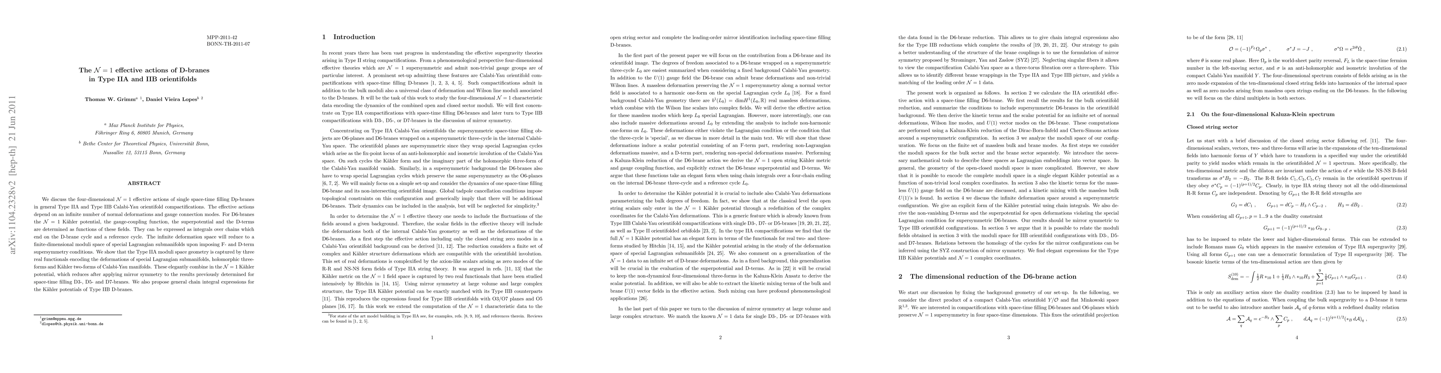 This paper explores the four-dimensional N=1 effective actions of D-branes in Type IIA and IIB orientifolds, determining the N=1 Kaehler potential, gauge-coupling, superpotential, and D-terms for D6-branes through integrals over cycles. It concludes that the infinite deformation space narrows to a finite moduli space of special Lagrangian submanifolds, with Type IIA moduli space geometry captured by three real functionals.