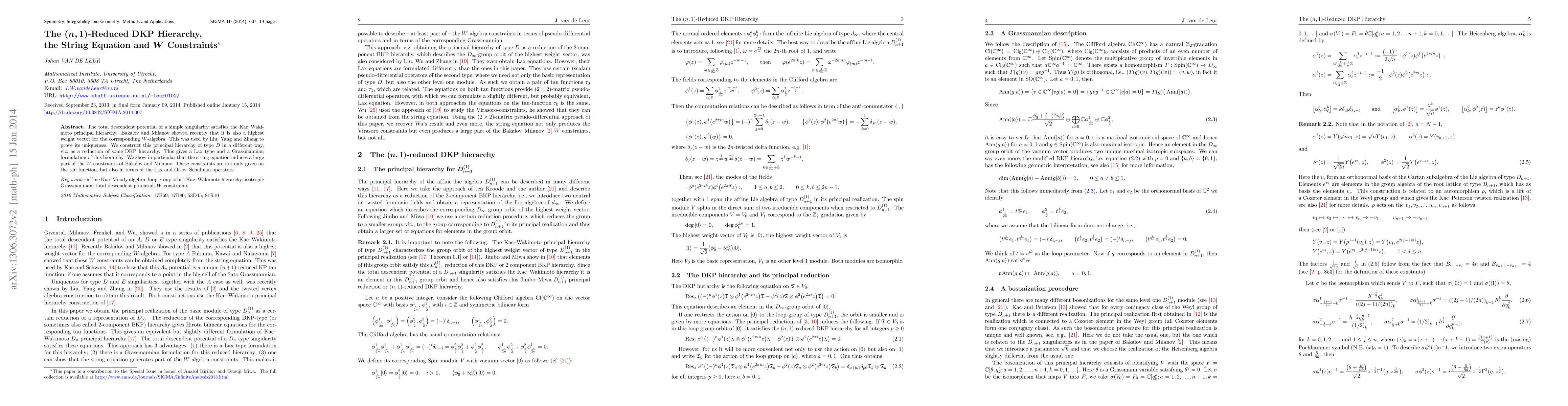 The total descendent potential of a simple singularity satisfies the Kac-Wakimoto principal hierarchy. Bakalov and Milanov showed recently that it is also a highest weight vector for the corresponding W-algebra. This was used by Liu, Yang and Zhang to prove its uniqueness. We construct this principal hierarchy of type D in a different way, viz. as a reduction of some DKP hierarchy. This gives a Lax type and a Grassmannian formulation of this hierarchy. We show in particular that the string equation induces a large part of the W constraints of Bakalov and Milanov. These constraints are not only given on the tau function, but also in terms of the Lax and Orlov-Schulman operators.