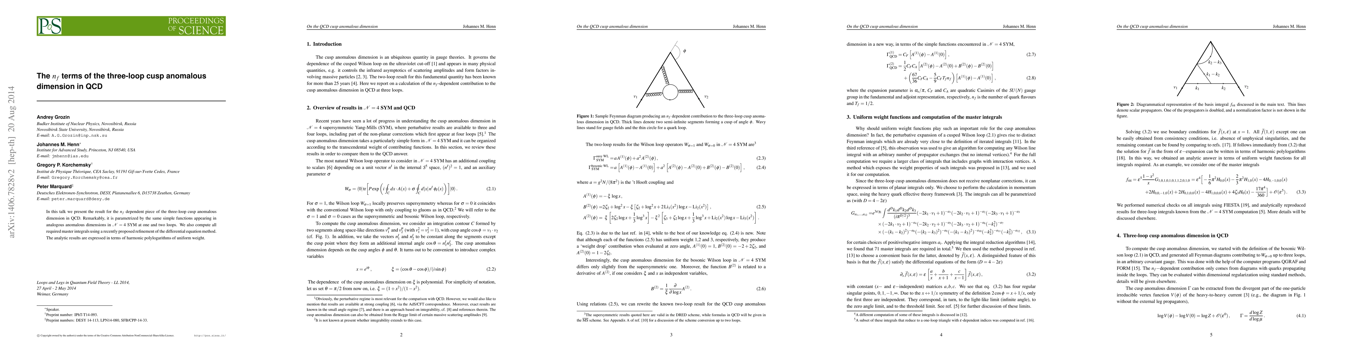 In this talk we present the result for the $n_f$ dependent piece of the three-loop cusp anomalous dimension in QCD. Remarkably, it is parametrized by the same simple functions appearing in analogous anomalous dimensions in ${\mathcal N}=4$ SYM at one and two loops. We also compute all required master integrals using a recently proposed refinement of the differential equation method. The analytic results are expressed in terms of harmonic polylogarithms of uniform weight.