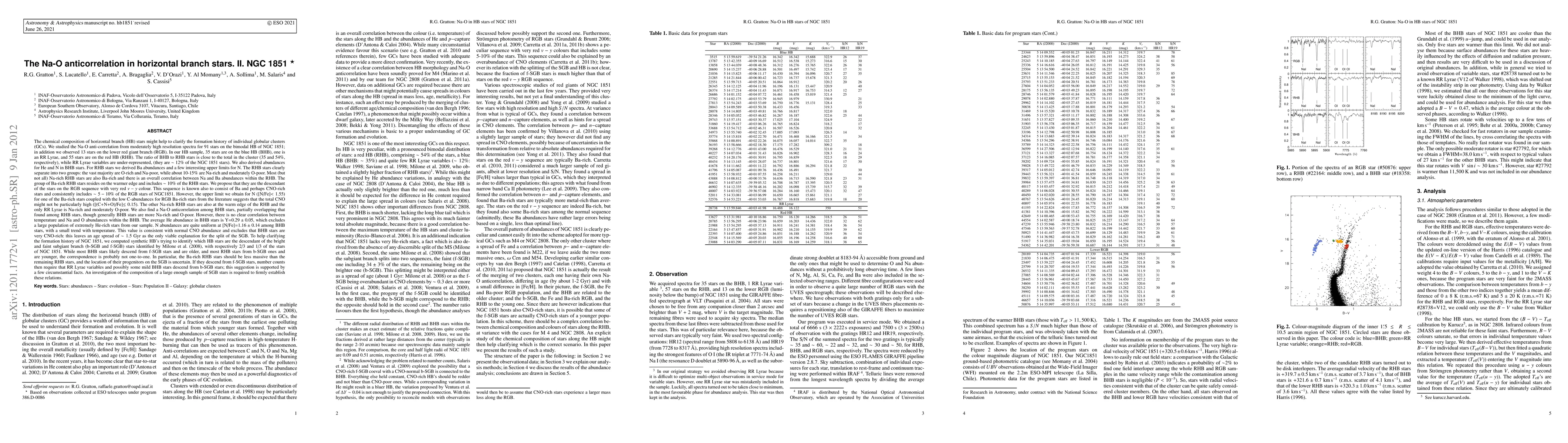 A study of 35 stars in NGC1851's blue and red horizontal branches found a Na-O anti-correlation, with red branch stars separating into O-rich and Na-poor groups, while blue branch stars show a similar trend but with more sodium abundance.