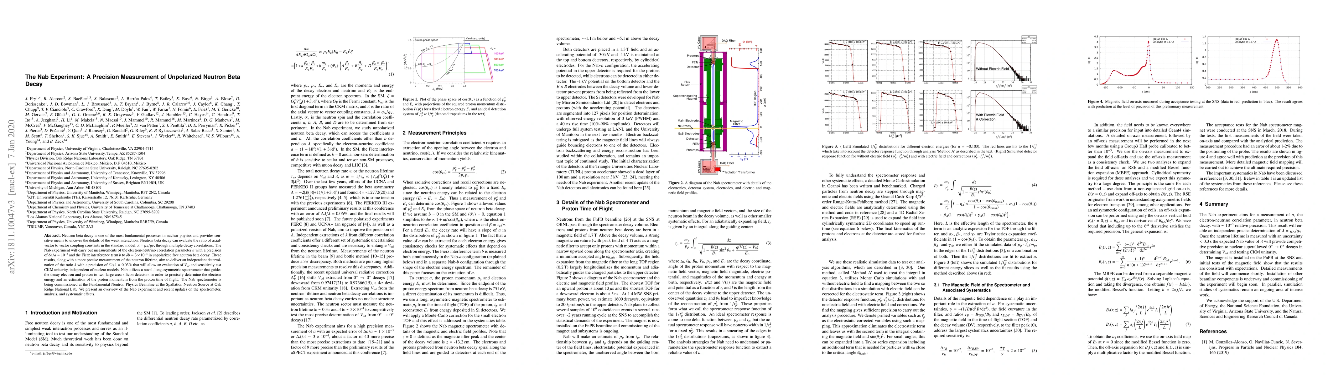 The Nab experiment aims to precisely measure unpolarized neutron beta decay to determine the ratio of axial-vector to vector coupling constants in the standard model, $\lambda = g_A / g_V$, with unprecedented accuracy. The experiment employs a novel asymmetric spectrometer to measure electron-neutrino correlation and the Fierz interference term, aiming to test CKM unitarity and evaluate $V_{ud}$.