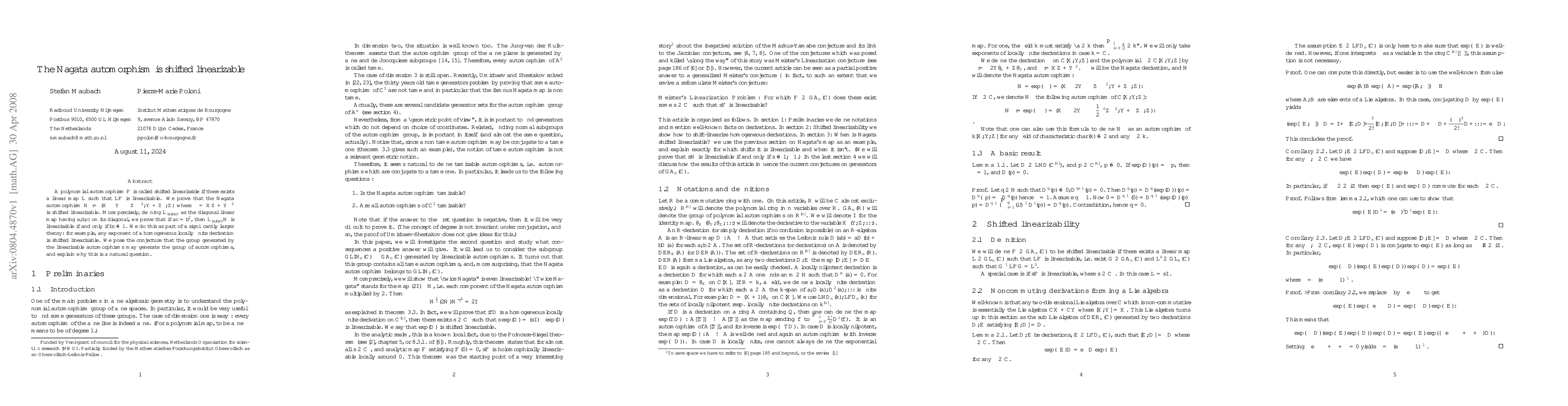 This paper proves that the Nagata automorphism is shifted linearizable, showing that it can be transformed into a linearizable form via a specific diagonal linear map under certain conditions. The authors also conjecture that the group generated by linearizable automorphisms may encompass the entire group of automorphisms.
