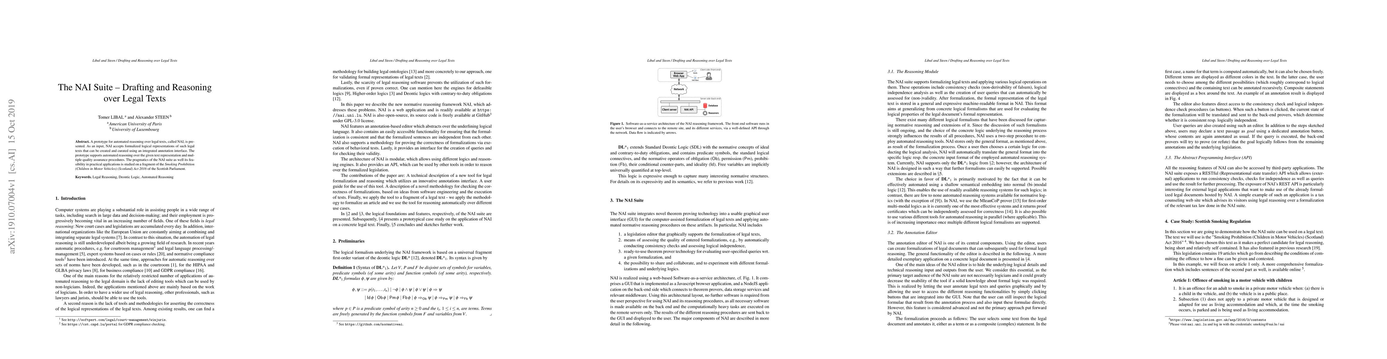 The NAI Suite is a prototype for automated reasoning over legal texts, utilizing an integrated annotation interface for text representation and supporting multiple quality assurance procedures. Its feasibility is demonstrated through application to a fragment of the Smoking Prohibition Act 2016.