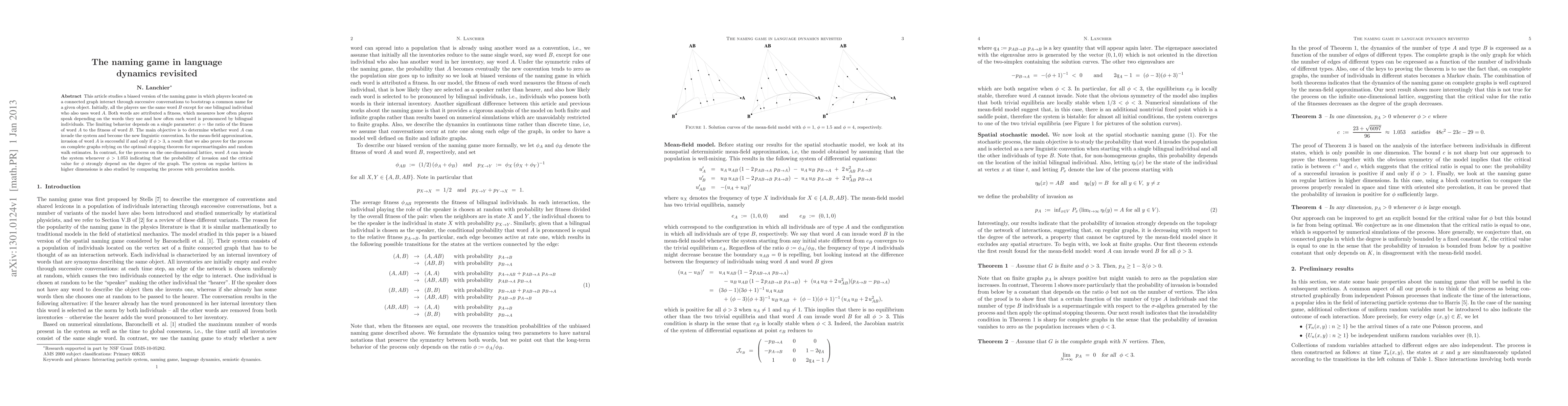 This article studies a biased version of the naming game in which players located on a connected graph interact through successive conversations to bootstrap a common name for a given object. Initially, all the players use the same word B except for one bilingual individual who also uses word A. Both words are attributed a fitness, which measures how often players speak depending on the words they use and how often each word is pronounced by bilingual individuals. The limiting behavior depends on a single parameter: phi = the ratio of the fitness of word A to the fitness of word B. The main objective is to determine whether word A can invade the system and become the new linguistic convention. In the mean-field approximation, invasion of word A is successful if and only if phi > 3, a result that we also prove for the process on complete graphs relying on the optimal stopping theorem for supermartingales and random walk estimates. In contrast, for the process on the one-dimensional lattice, word A can invade the system whenever phi > 1.053 indicating that the probability of invasion and the critical value for phi strongly depend on the degree of the graph. The system on regular lattices in higher dimensions is also studied by comparing the process with percolation models.