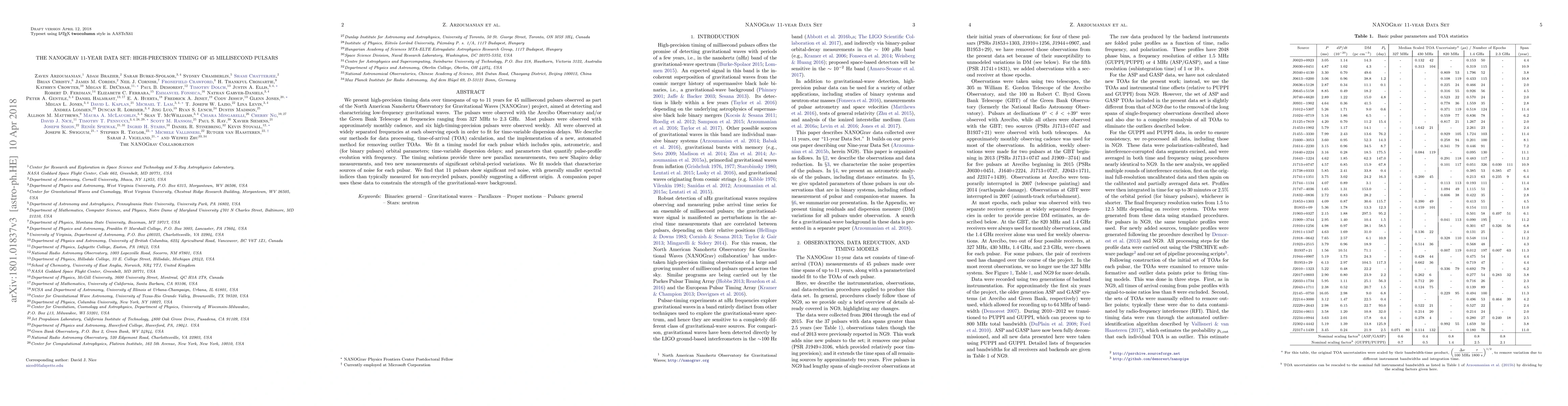 The NANOGrav 11-year dataset presents high-precision timing data for 45 millisecond pulsars, aiming to detect low-frequency gravitational waves. The study identifies significant red noise in 11 pulsars, potentially indicating a different origin, and lays the groundwork for future gravitational wave signal detection.