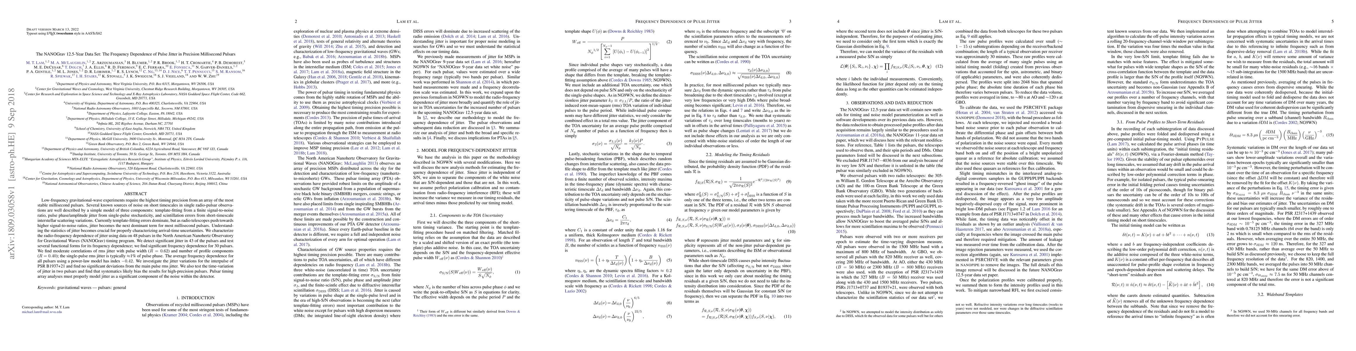 The NANOGrav 12.5-year dataset reveals significant frequency dependence of pulse jitter in 30 out of 48 millisecond pulsars, indicating that jitter is a crucial noise component for future gravitational-wave experiments. The average frequency dependence follows a power-law model with an index of -0.42, highlighting the importance of accurately modeling jitter for pulsar timing array analyses.