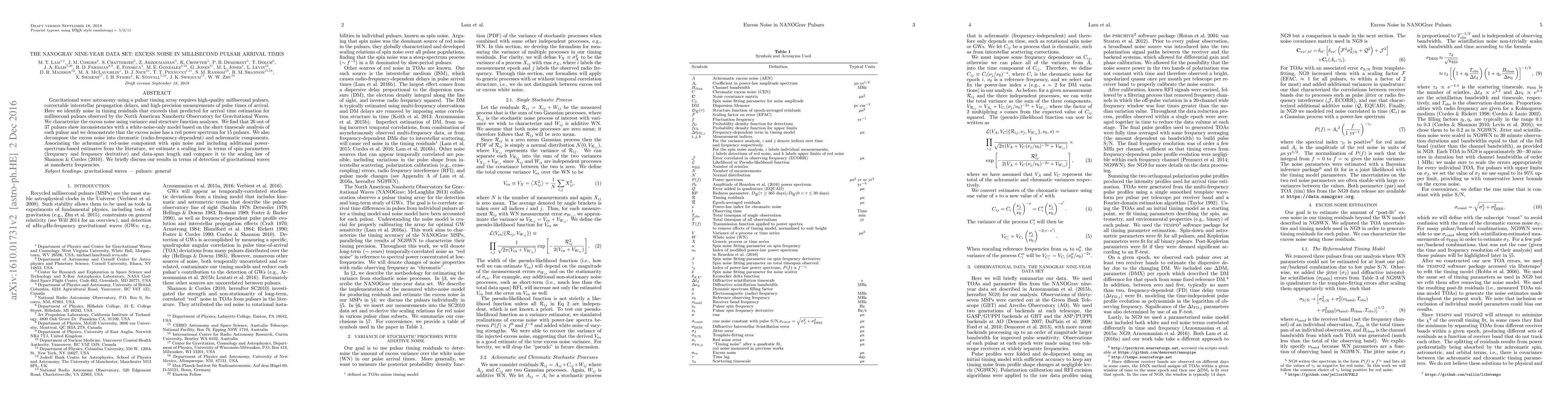 The NANOGrav nine-year dataset reveals significant excess noise in the arrival times of millisecond pulsars, with 26 out of 37 pulsars showing red power spectrum characteristics, indicating non-white noise. This excess noise is decomposed into chromatic and achromatic components, with the achromatic part linked to spin noise, providing insights into gravitational wave detection at nanohertz frequencies.