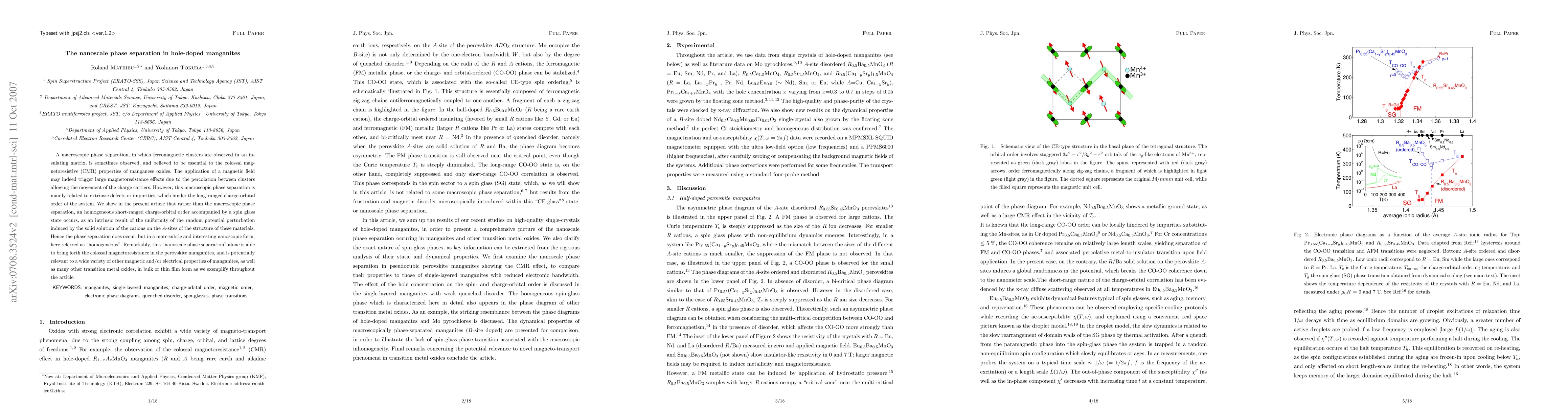 This paper reveals that nanoscale phase separation, characterized by a homogeneous short-ranged charge-orbital order and a spin glass state, is intrinsic to hole-doped manganites and is responsible for colossal magnetoresistance, rather than the previously assumed macroscopic phase separation. This nanoscale phase separation is induced by the uniformity of random potential perturbations from cation solid solutions.