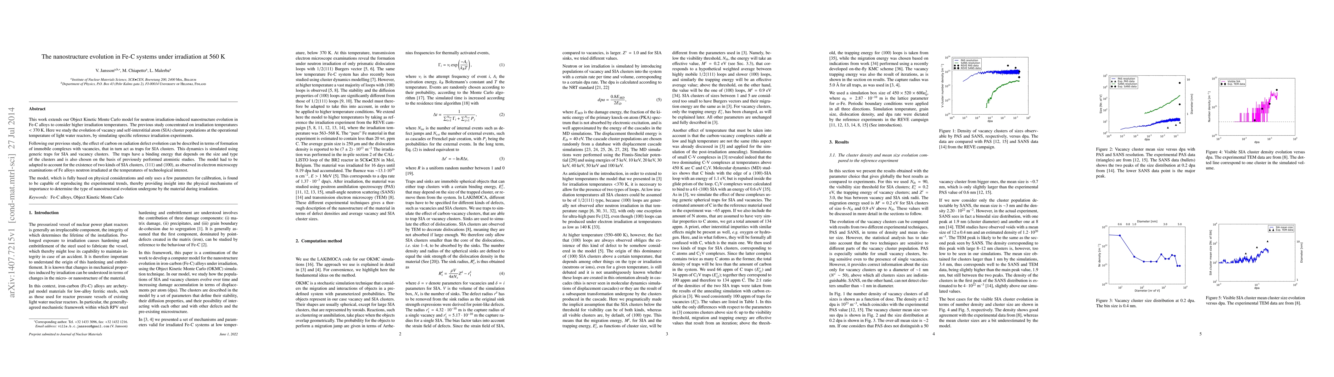 This study enhances a computational model to simulate nanostructure evolution in Fe-C alloys under irradiation at higher temperatures, specifically up to 560 K, building on previous work below 370 K. The model, grounded in physical principles and few calibrated parameters, successfully reproduces experimental data, revealing key mechanisms of radiation-induced nanostructural changes in reactor-relevant conditions.