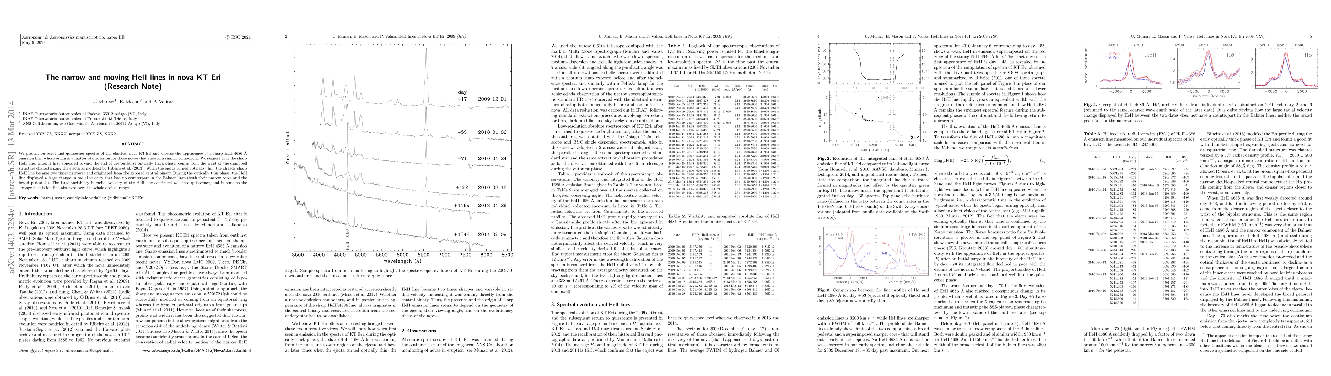 The paper analyzes the spectra of the nova KT Eri, identifying a sharp HeII 4686 Å emission line that originates from the ejecta's wrist structure during the optically thick phase and later from the central binary during the thin phase, showing significant radial velocity variability. The HeII line remains the strongest emission line throughout the nova's evolution.