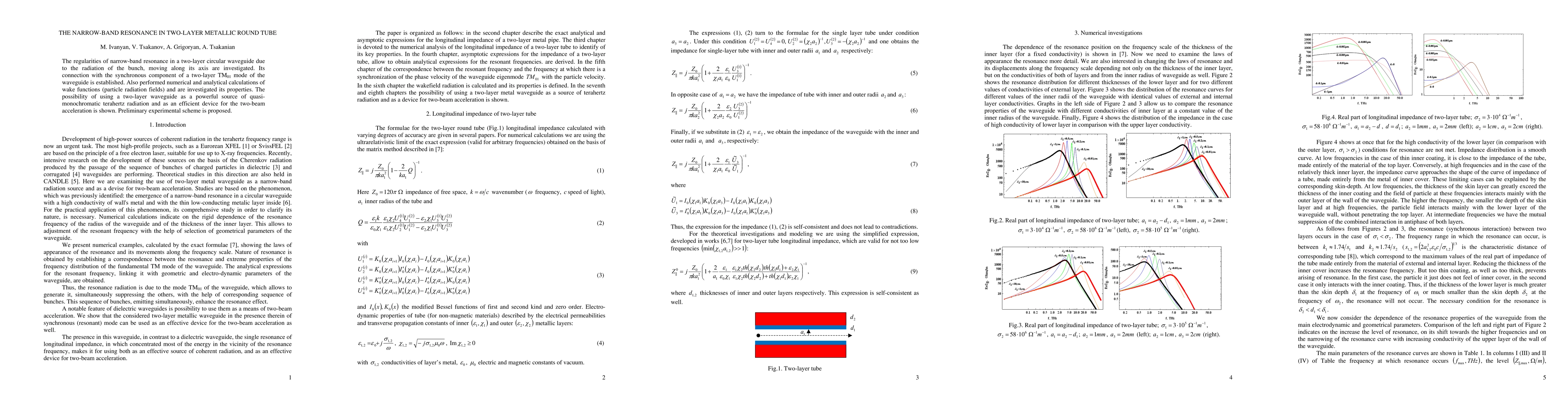 The regularities of narrow-band resonance in a two-layer circular waveguide due to the radiation of the bunch, moving along its axis are investigated. Its connection with the synchronous component of a two-layer TM01 mode of the waveguide is established. Also performed numerical and analytical calculations of wake functions (particle radiation fields) and are investigated its properties. The possibility of using a two-layer waveguide as a powerful source of quasi-monochromatic terahertz radiation and as an efficient device for the two-beam acceleration is shown. Preliminary experimental scheme is proposed.