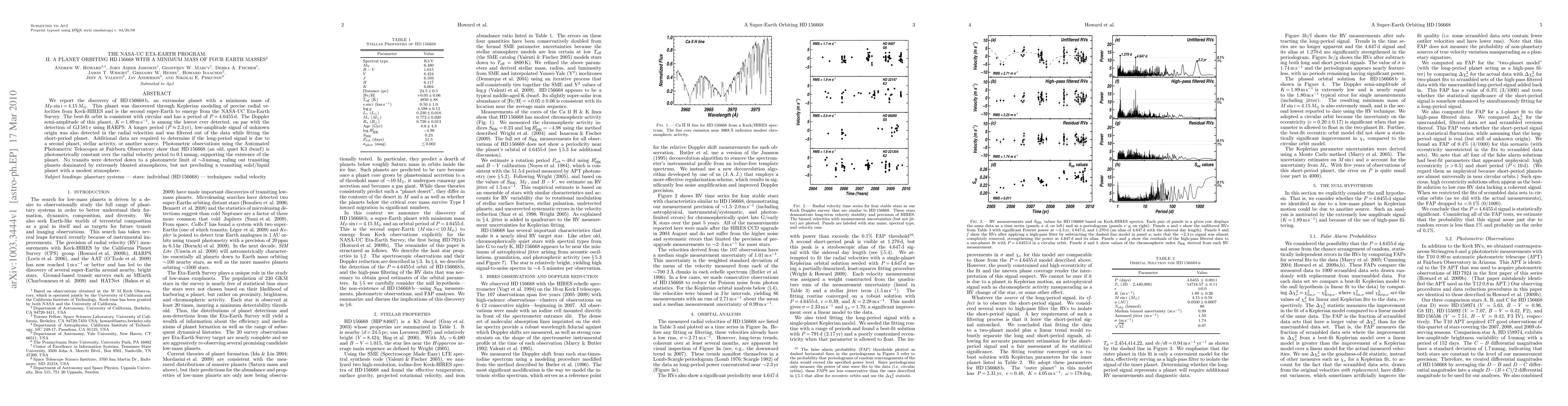 The NASA-UC Eta-Earth Survey discovered HD 156668b, a super-Earth with a minimum mass of 4.15 Earth masses orbiting a K3 dwarf star every 4.6455 days. A secondary low-amplitude signal was detected but its origin remains uncertain. Photometric observations confirm the star's stability, supporting the planet's existence.