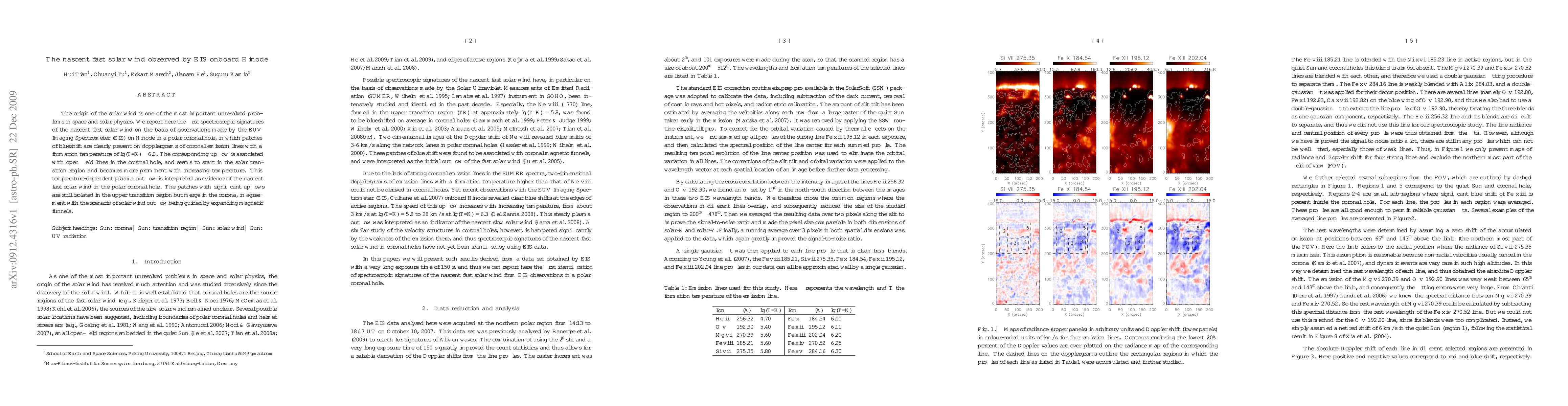 This paper reports the first spectroscopic evidence of the nascent fast solar wind observed in a polar coronal hole using the EIS on Hinode, showing blueshifted patches in dopplergrams indicative of upflows starting in the transition region and becoming more prominent with higher temperatures. The findings support the theory of solar wind guided by expanding magnetic funnels.
