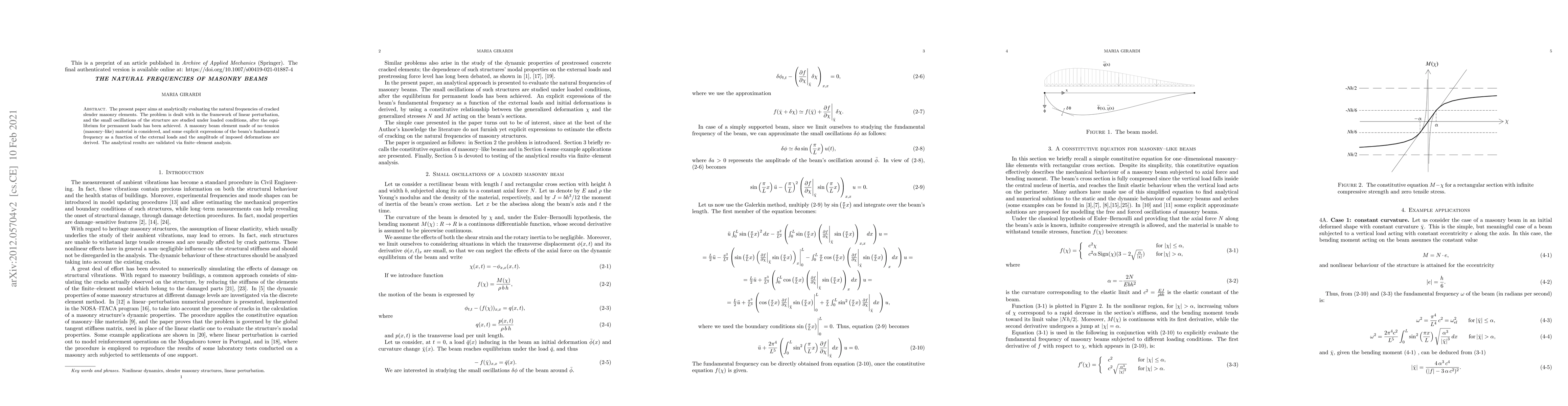 Researchers developed analytical expressions for the natural frequencies of cracked masonry beams under various external loads and deformations, validating their findings with finite-element analysis.