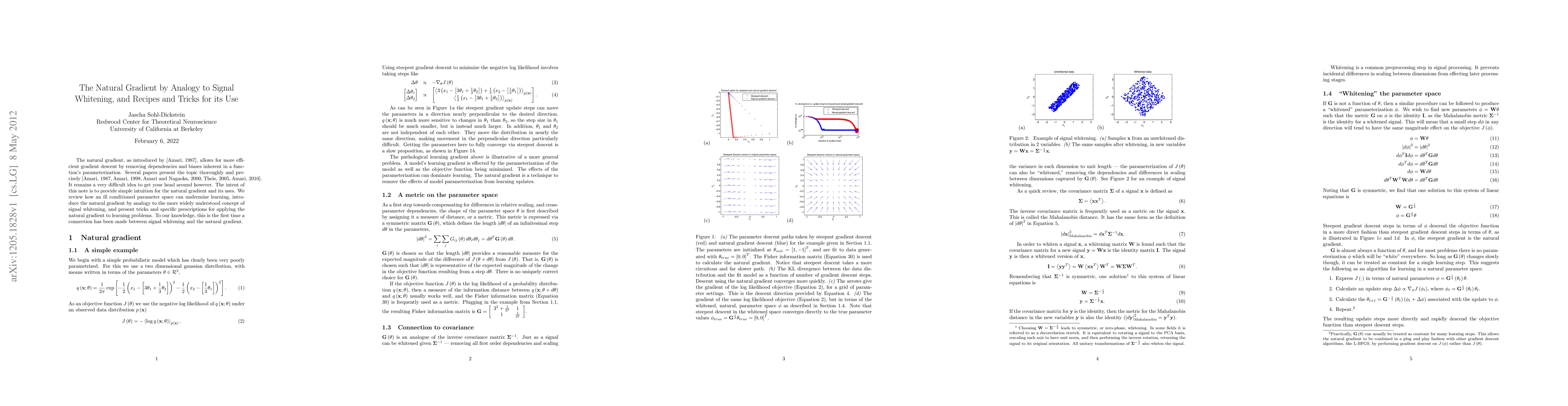 The natural gradient allows for more efficient gradient descent by removing dependencies and biases inherent in a function's parameterization. Several papers present the topic thoroughly and precisely. It remains a very difficult idea to get your head around however. The intent of this note is to provide simple intuition for the natural gradient and its use. We review how an ill conditioned parameter space can undermine learning, introduce the natural gradient by analogy to the more widely understood concept of signal whitening, and present tricks and specific prescriptions for applying the natural gradient to learning problems.