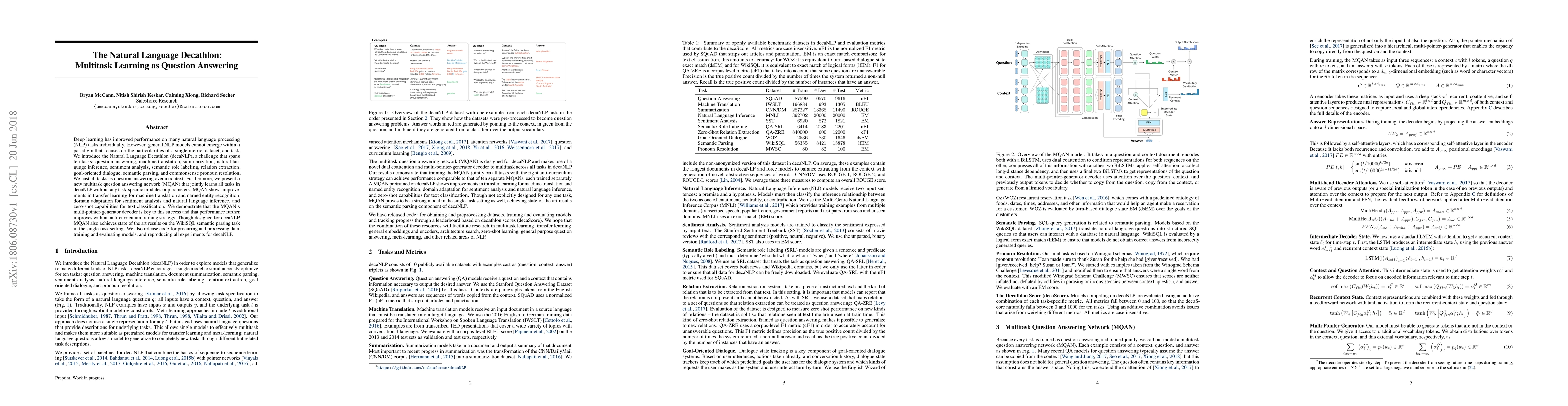 The Natural Language Decathlon (decaNLP) introduces a multitask learning framework where ten diverse NLP tasks are unified as question answering over a context. The Multitask Question Answering Network (MQAN) jointly learns these tasks without task-specific modules, demonstrating improved transfer learning, domain adaptation, and zero-shot capabilities.