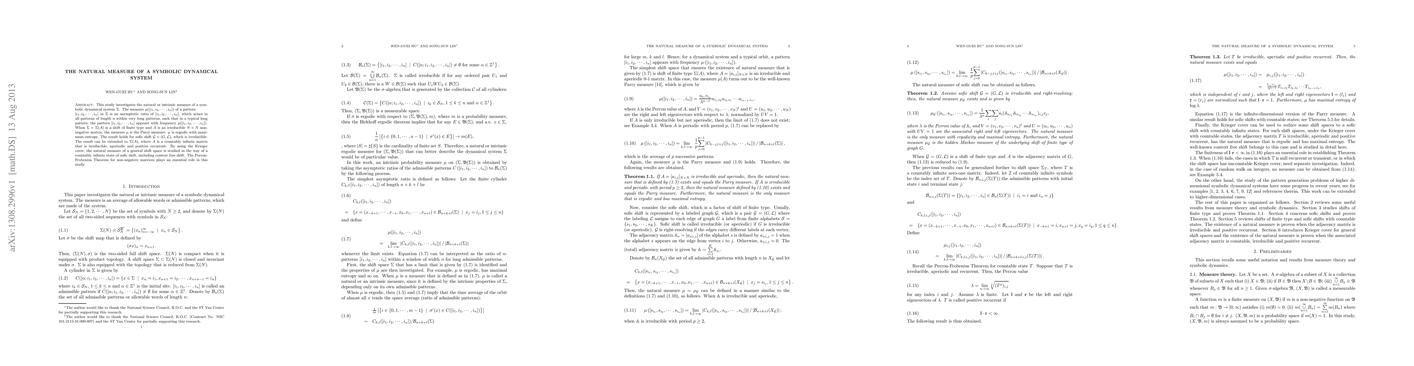 This study investigates the natural or intrinsic measure of a symbolic dynamical system $\Sigma$. The measure $\mu([i_{1},i_{2},...,i_{n}])$ of a pattern $[i_{1},i_{2},...,i_{n}]$ in $\Sigma$ is an asymptotic ratio of $[i_{1},i_{2},...,i_{n}]$, which arises in all patterns of length $n$ within very long patterns, such that in a typical long pattern, the pattern $[i_{1},i_{2},...,i_{n}]$ appears with frequency $\mu([i_{1},i_{2},...,i_{n}])$. When $\Sigma=\Sigma(A)$ is a shift of finite type and $A$ is an irreducible $N\times N$ non-negative matrix, the measure $\mu$ is the Parry measure. $\mu$ is ergodic with maximum entropy. The result holds for sofic shift $\mathcal{G}=(G,\mathcal{L})$, which is irreducible. The result can be extended to $\Sigma(A)$, where $A$ is a countably infinite matrix that is irreducible, aperiodic and positive recurrent. By using the Krieger cover, the natural measure of a general shift space is studied in the way of a countably infinite state of sofic shift, including context free shift. The Perron-Frobenius Theorem for non-negative matrices plays an essential role in this study.