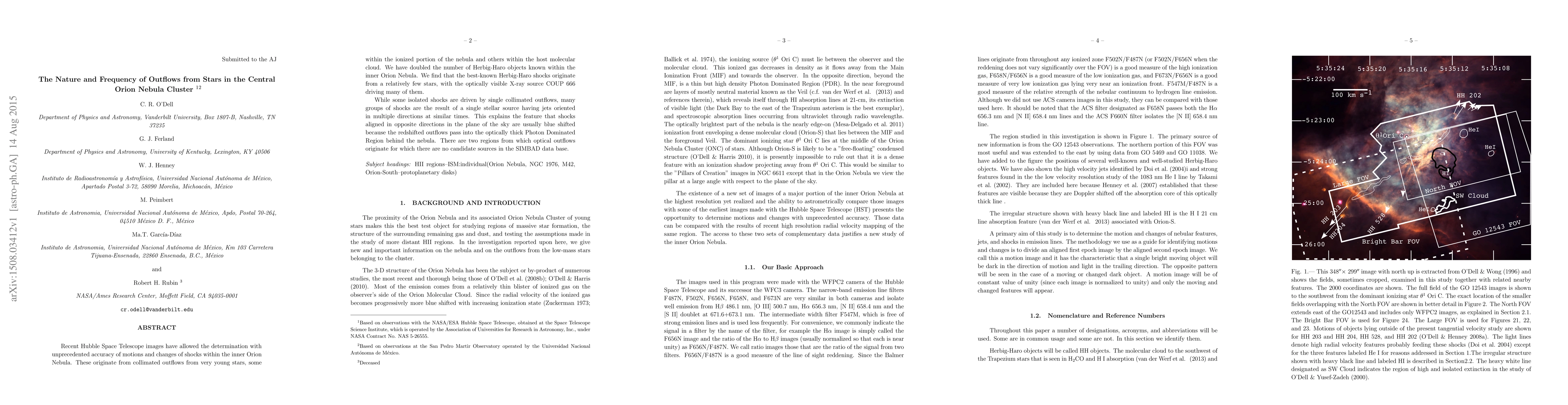 Recent Hubble Space Telescope images have allowed the determination with unprecedented accuracy of motions and changes of shocks within the inner Orion Nebula. These originate from collimated outflows from very young stars, some within the ionized portion of the nebula and others within the host molecular cloud. We have doubled the number of Herbig-Haro objects known within the inner Orion Nebula. We find that the best-known Herbig-Haro shocks originate from a relatively few stars, with the optically visible X-ray source COUP 666 driving many of them. While some isolated shocks are driven by single collimated outflows, many groups of shocks are the result of a single stellar source having jets oriented in multiple directions at similar times. This explains the feature that shocks aligned in opposite directions in the plane of the sky are usually blue shifted because the redshifted outflows pass into the optically thick Photon Dominated Region behind the nebula. There are two regions from which optical outflows originate for which there are no candidate sources in the SIMBAD data base.