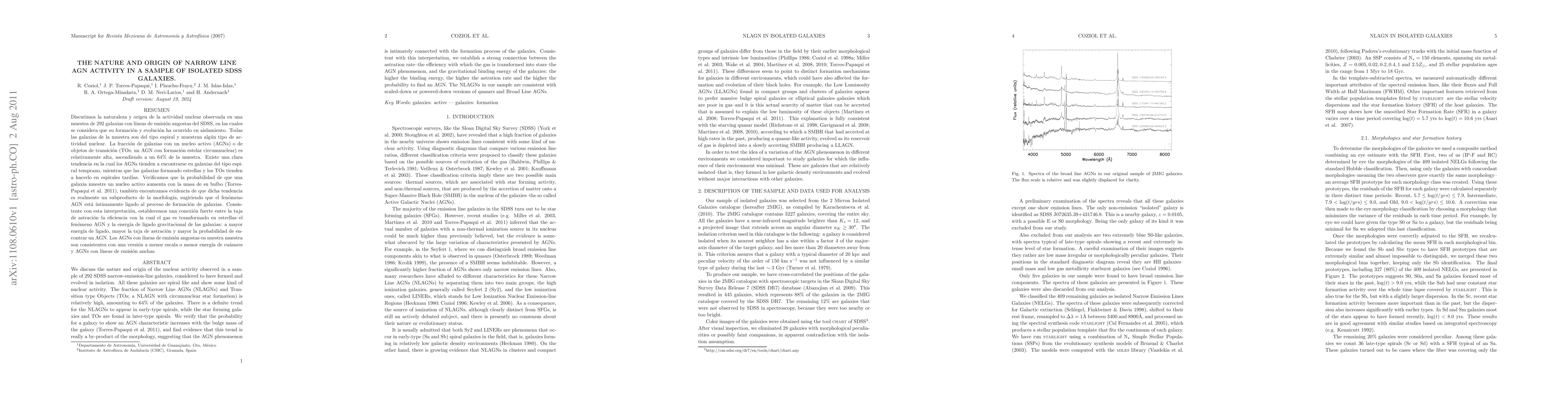 We discuss the nature and origin of the nuclear activity observed in a sample of 292 SDSS narrow-emission-line galaxies, considered to have formed and evolved in isolation. All these galaxies are spiral like and show some kind of nuclear activity. The fraction of Narrow Line AGNs (NLAGNs) and Transition type Objects (TOs; a NLAGN with circumnuclear star formation) is relatively high, amounting to 64% of the galaxies. There is a definite trend for the NLAGNs to appear in early-type spirals, while the star forming galaxies and TOs are found in later-type spirals. We verify that the probability for a galaxy to show an AGN characteristic increases with the bulge mass of the galaxy (Torre-Papaqui et al. 2011), and find evidence that this trend is really a by-product of the morphology, suggesting that the AGN phenomenon is intimately connected with the formation process of the galaxies. Consistent with this interpretation, we establish a strong connection between the astration rate--the efficiency with which the gas is transformed into stars--the AGN phenomenon, and the gravitational binding energy of the galaxies: the higher the binding energy, the higher the astration rate and the higher the probability to find an AGN. The NLAGNs in our sample are consistent with scaled-down or powered-down versions of quasars and Broad Line AGNs.