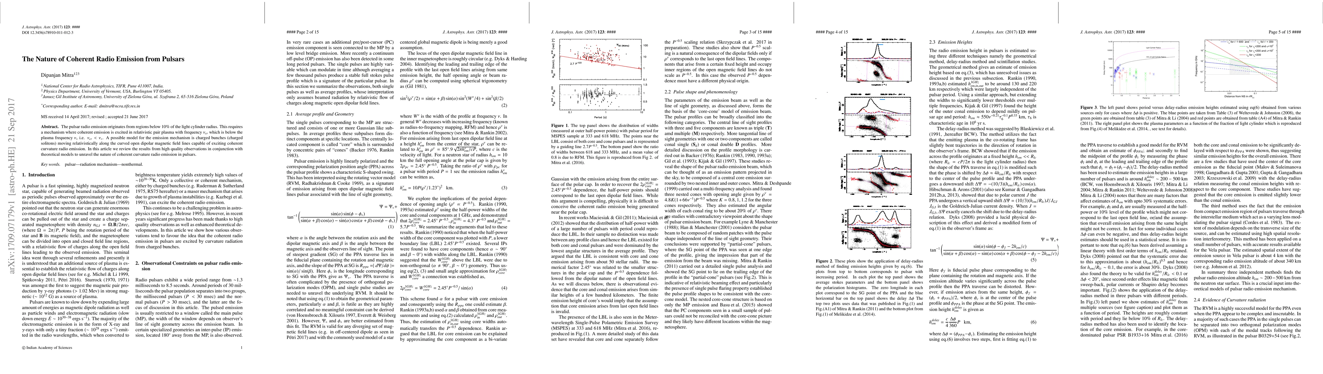This paper reviews high-quality observational data and theoretical models to understand the coherent radio emission from pulsars, proposing that charged solitons moving along magnetic field lines generate this emission via coherent curvature radiation. The emission mechanism is hypothesized to operate in a relativistic pair plasma where the critical frequency is below the plasma frequency.