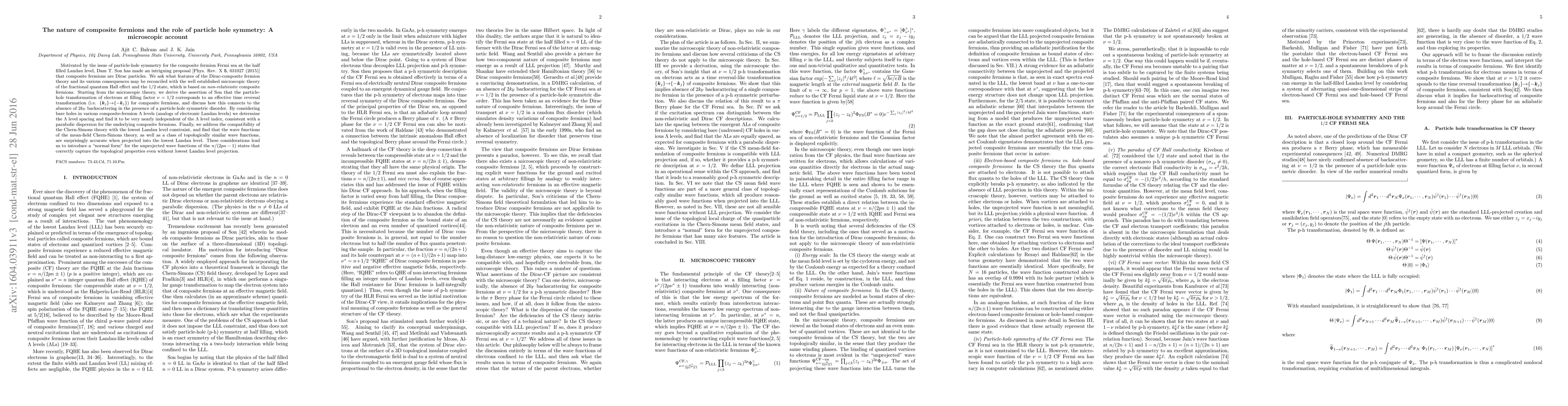 Motivated by the issue of particle-hole symmetry for the composite fermion Fermi sea at the half filled Landau level, Dam T. Son has made an intriguing proposal [Phys. Rev. X {\bf 5}, 031027 (2015)] that composite fermions are Dirac particles. We ask what features of the Dirac-composite fermion theory and its various consequences may be reconciled with the well established microscopic theory of the fractional quantum Hall effect and the 1/2 state, which is based on {\em non-relativistic} composite fermions. Starting from the microscopic theory, we derive the assertion of Son that the particle-hole transformation of electrons at filling factor $\nu=1/2$ corresponds to an effective time reversal transformation (i.e. $\{\vec{k}_j\}$$\rightarrow$$\{-\vec{k}_j\}$) for composite fermions, and discuss how this connects to the absence of $2k_{\rm F}$ backscattering in the presence of a particle-hole symmetric disorder. By considering bare holes in various composite-fermion $\Lambda$ levels (analogs of electronic Landau levels) we determine the $\Lambda$ level spacing and find it to be very nearly independent of the $\Lambda$ level index, consistent with a parabolic dispersion for the underlying composite fermions. Finally, we address the compatibility of the Chern-Simons theory with the lowest Landau level constraint, and find that the wave functions of the mean-field Chern-Simons theory, as well as a class of topologically similar wave functions, are surprisingly accurate when projected into the lowest Landau level. These considerations lead us to introduce a "normal form" for the unprojected wave functions of the $n/(2pn-1)$ states that correctly capture the topological properties even without lowest Landau level projection.