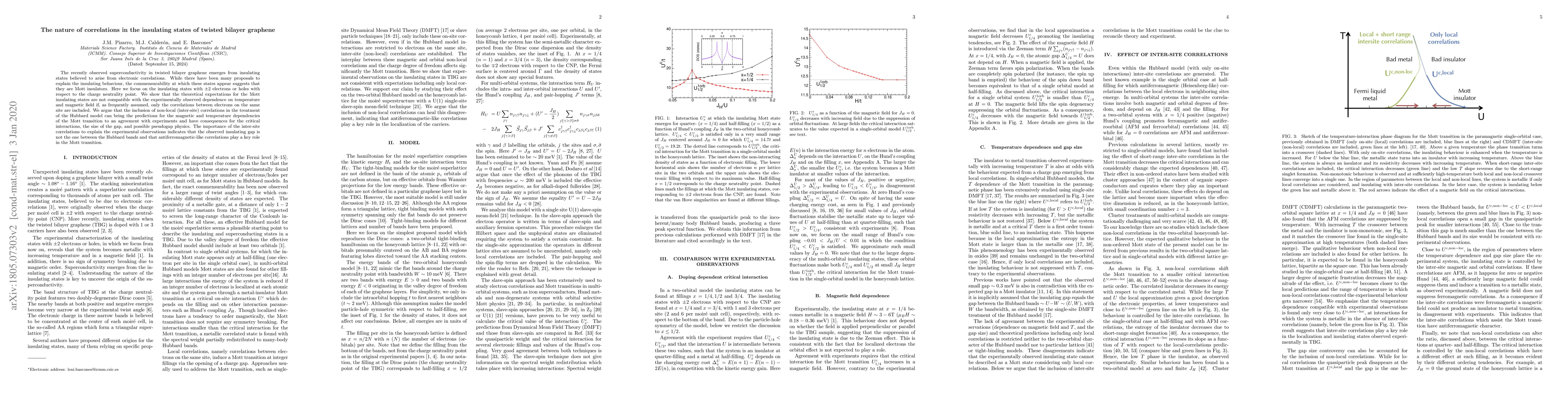 The recently observed superconductivity in twisted bilayer graphene emerges from insulating states believed to arise from electronic correlations. While there have been many proposals to explain the insulating behaviour, the commensurability at which these states appear suggests that they are Mott insulators. Here we focus on the insulating states with $\pm 2$ electrons or holes with respect to the charge neutrality point. We show that the theoretical expectations for the Mott insulating states are not compatible with the experimentally observed dependence on temperature and magnetic field if, as frequently assumed, only the correlations between electrons on the same site are included. We argue that the inclusion of non-local (inter-site) correlations in the treatment of the Hubbard model can bring the predictions for the magnetic and temperature dependencies of the Mott transition to an agreement with experiments and have consequences for the critical interactions, the size of the gap, and possible pseudogap physics. The importance of the inter-site correlations to explain the experimental observations indicates that the observed insulating gap is not the one between the Hubbard bands and that antiferromagnetic-like correlations play a key role in the Mott transition.