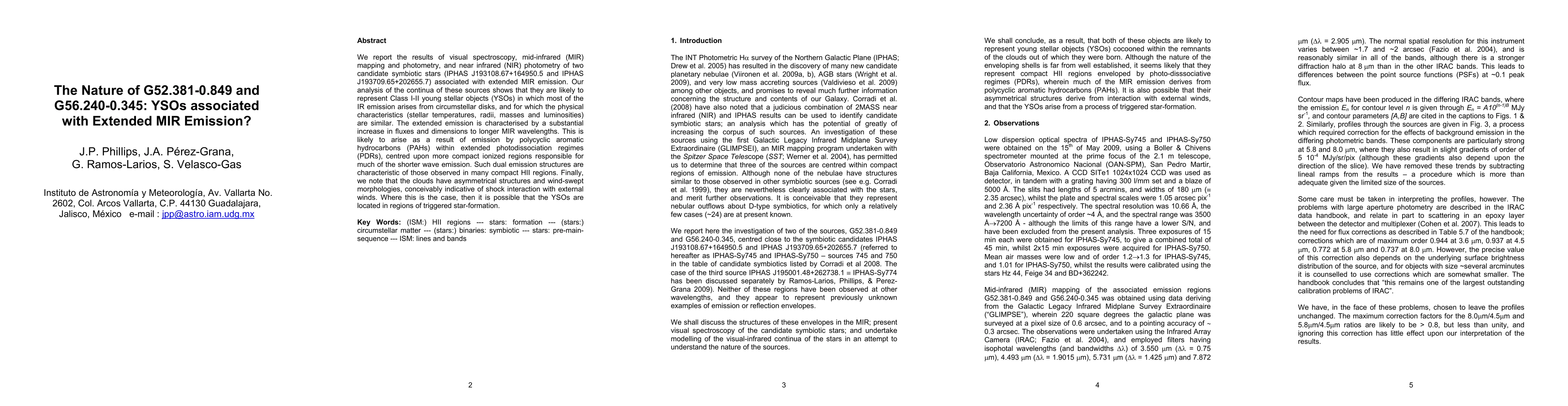 We report the results of visual spectroscopy, mid-infrared (MIR) mapping and photometry, and near-infrared photometry of two candidate symbiotic stars (IPHAS J193108.67+164950.5 and IPHAS J193709.65+202655.7) associated with extended MIR emission. Our analysis of the continua of these sources shows that they are likely to represent Class I-II young stellar objects (YSOs) in which most of the IR emission arises from circumstellar discs, and for which the physical characteristics (stellar temperatures, radii, masses and luminosities) are similar. The extended emission is characterized by a substantial increase in fluxes and dimensions to longer MIR wavelengths. This is likely to arise as a result of emission by polycyclic aromatic hydrocarbons within extended photodissociation regimes, centred upon more compact ionized regions responsible for much of the shorter wave emission. Such dual emission structures are characteristic of those observed in many compact HII regions. Finally, we note that the clouds have asymmetrical structures and wind-swept morphologies, conceivably indicative of shock interaction with external winds. Where this is the case, then it is possible that the YSOs are located in regions of triggered star formation.