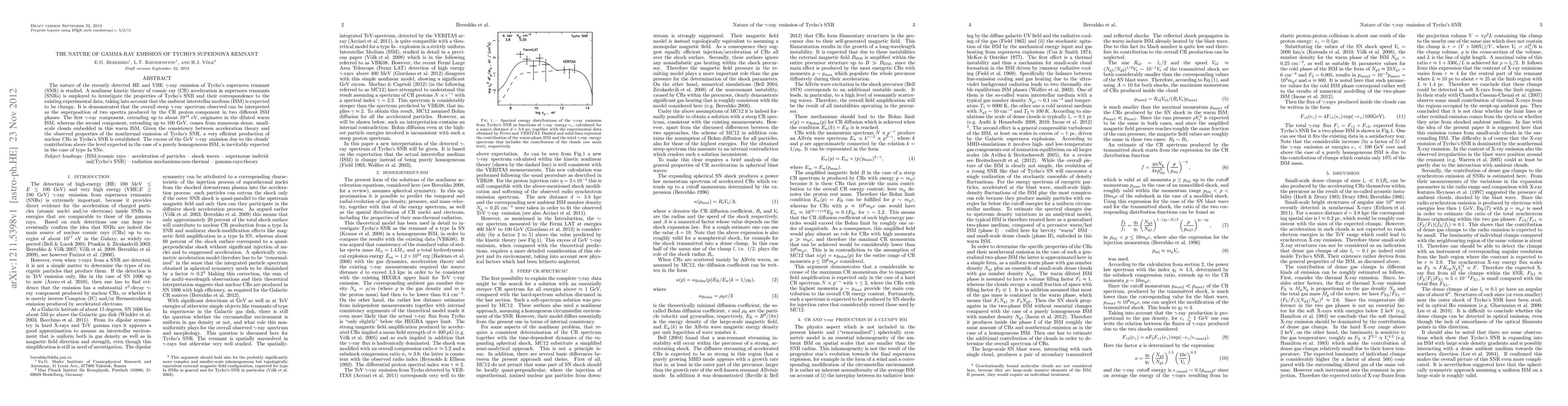 This paper investigates the gamma-ray emission from Tycho's supernova remnant using a nonlinear kinetic theory of cosmic ray acceleration, demonstrating that the observed spectrum results from protons in both diluted warm ISM and dense clouds. The study confirms efficient nuclear cosmic ray production in the remnant.