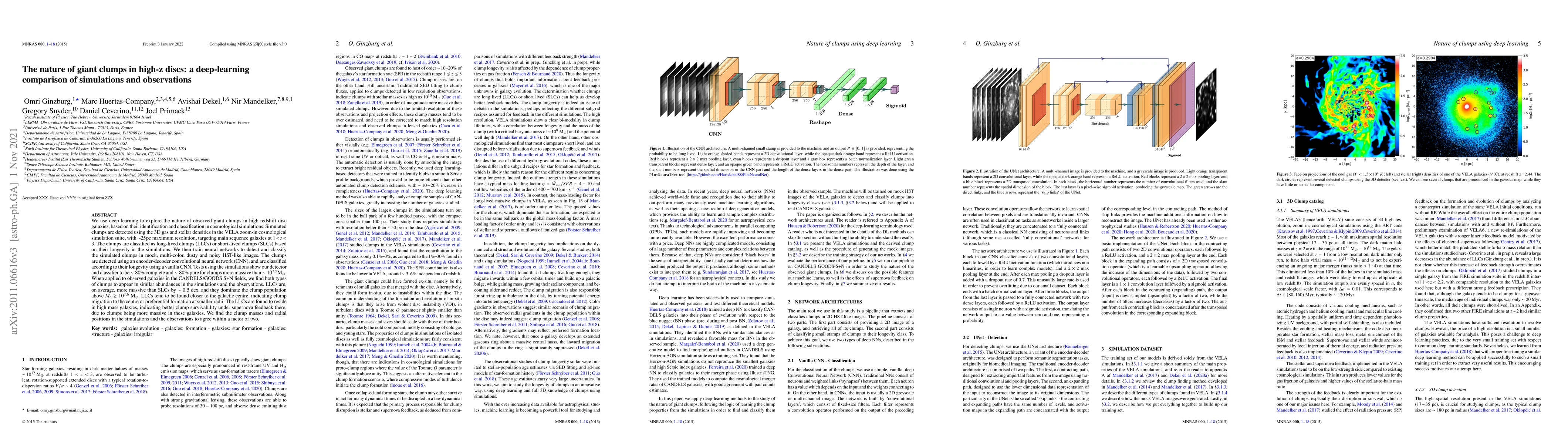 This paper employs deep learning to analyze giant clumps in high-redshift disc galaxies, comparing simulated data from the VELA cosmological simulation with observations from CANDELS/GOODS S+N fields. The study finds that long-lived clumps dominate massive populations and are more likely to migrate towards galactic centers, with properties in simulations and observations matching within a factor of two.