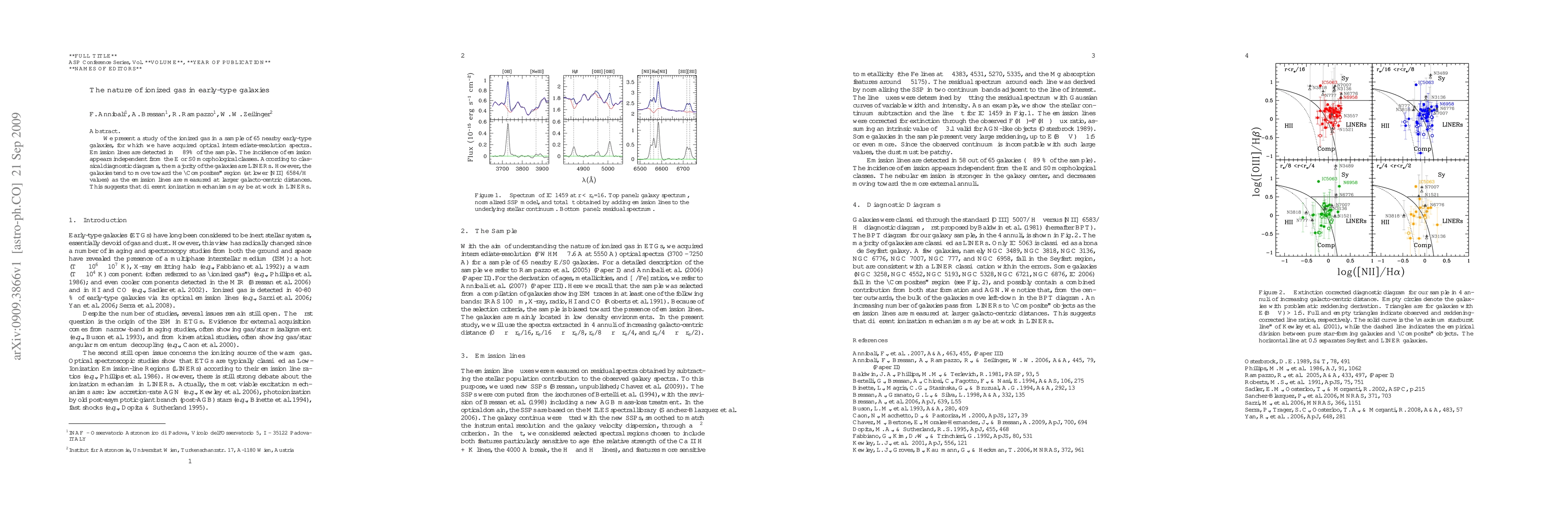 This study investigates ionized gas in 65 nearby early-type galaxies, finding emission lines in ~89% of them, with no clear correlation to their E or S0 classification. Most galaxies are LINERs, but their emission lines shift towards "Composites" with distance, indicating varied ionization mechanisms.