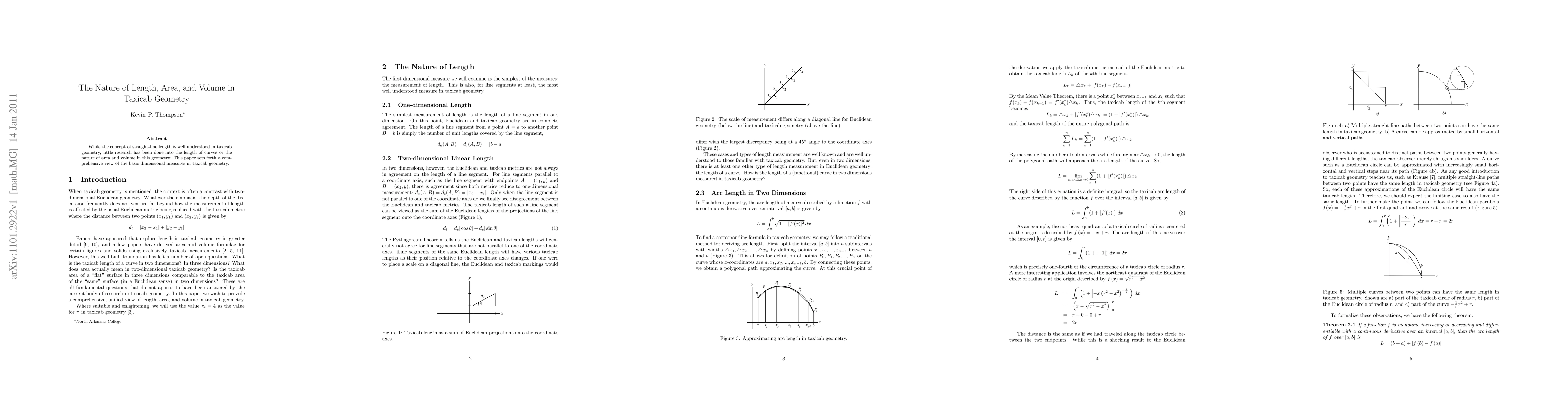 This paper explores the fundamental measures of length, area, and volume in taxicab geometry, providing a detailed examination of how these concepts differ from traditional Euclidean geometry. It aims to fill the research gap regarding the nature of curves and higher-dimensional measures in this alternative geometric framework.
