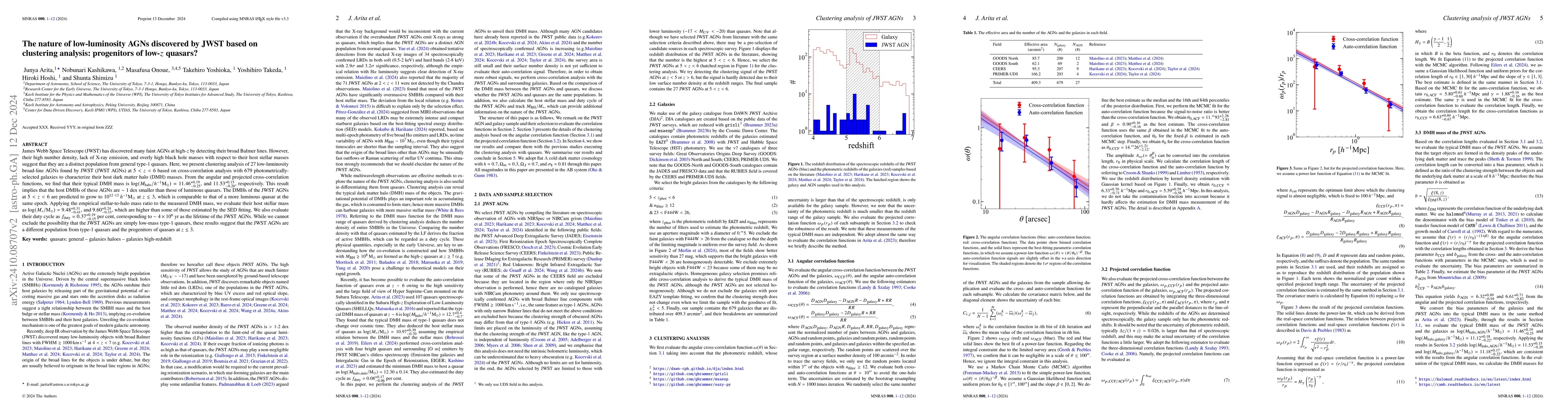 The JWST has identified faint, low-luminosity AGNs at high redshifts ($5<z<6$) distinct from typical type-1 quasars, with clustering analysis indicating smaller host dark matter halo masses. These AGNs may represent a precursor population to more luminous quasars at lower redshifts.