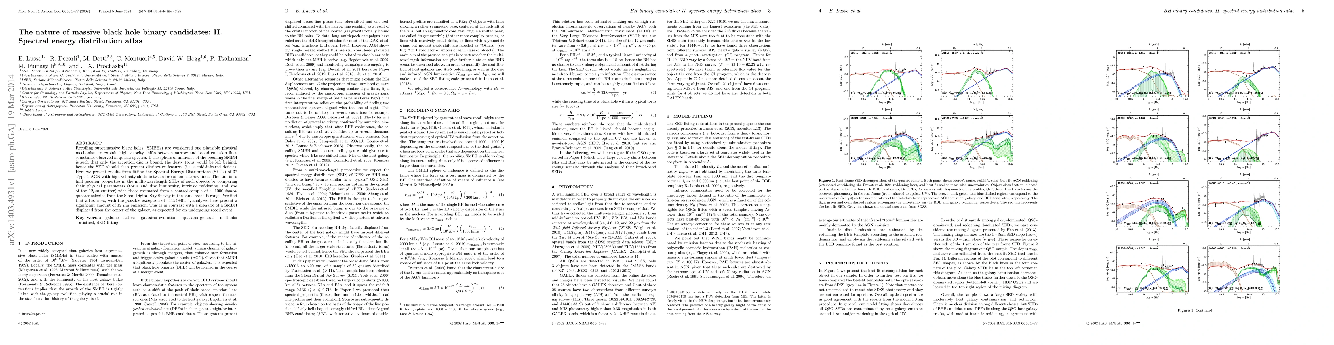 Recoiling supermassive black holes (SMBHs) are considered one plausible physical mechanism to explain high velocity shifts between narrow and broad emission lines sometimes observed in quasar spectra. If the sphere of influence of the recoiling SMBH is such that only the accretion disc is bound, the dusty torus would be left behind, hence the SED should then present distinctive features (i.e. a mid-infrared deficit). Here we present results from fitting the Spectral Energy Distributions (SEDs) of 32 Type-1 AGN with high velocity shifts between broad and narrow lines. The aim is to find peculiar properties in the multi-wavelength SEDs of such objects by comparing their physical parameters (torus and disc luminosity, intrinsic reddening, and size of the 12$\mu$m emitter) with those estimated from a control sample of $\sim1000$ \emph{typical} quasars selected from the Sloan Digital Sky Survey in the same redshift range. We find that all sources, with the possible exception of J1154+0134, analysed here present a significant amount of 12~$\mu$m emission. This is in contrast with a scenario of a SMBH displaced from the center of the galaxy, as expected for an undergoing recoil event.