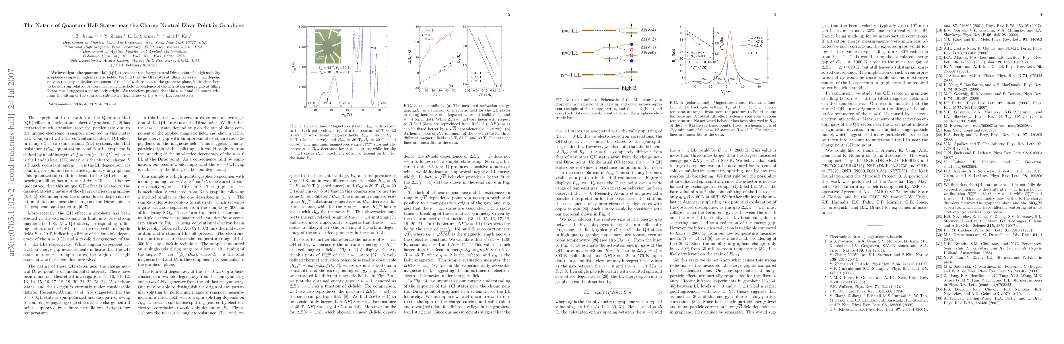 This study examines quantum Hall states near graphene's charge neutral Dirac point, revealing that states at filling factors $\nu=\pm1$ are unaffected by spin and are instead influenced by the perpendicular magnetic field. The non-linear magnetic field dependence of the activation energy gap at $\nu=1$ hints at a many-body effect, suggesting the $\nu=0$ and $\pm1$ states emerge from the lifting of spin and sub-lattice degeneracy.