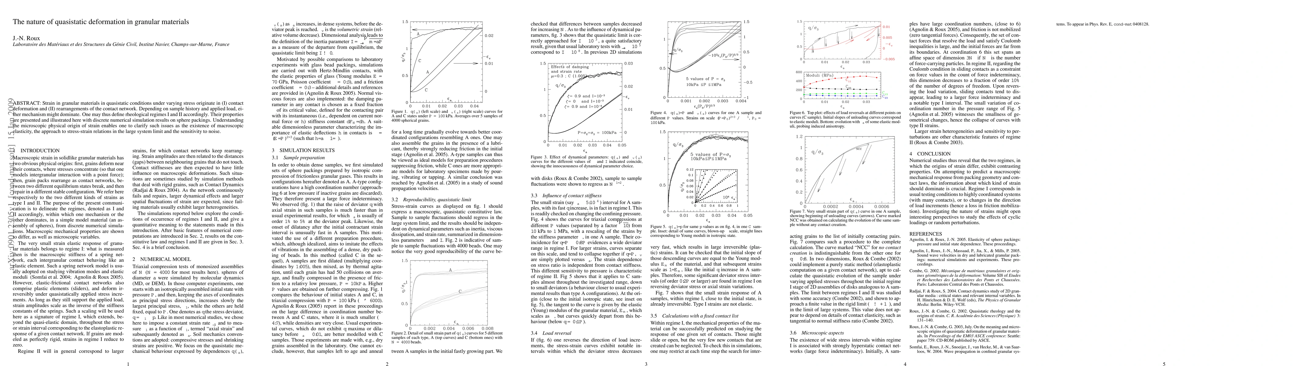 This paper investigates the quasistatic deformation in granular materials, attributing strain to contact deformation and contact network rearrangements. It identifies two rheological regimes based on dominant mechanisms, illustrated through numerical simulations on sphere packings, to clarify macroscopic elasticity and stress-strain relations.
