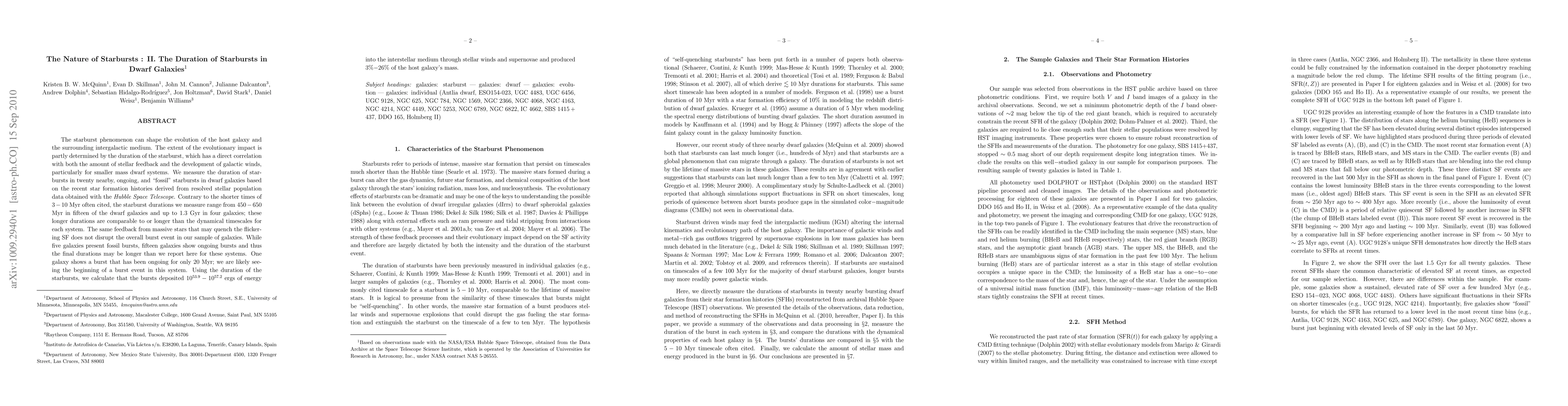 This paper investigates the duration of starbursts in dwarf galaxies, finding that the starbursts last significantly longer than previously thought, ranging from 450-650 Myr to 1.3 Gyr. These extended bursts deposit substantial energy into the interstellar medium and contribute significantly to the host galaxy's mass.