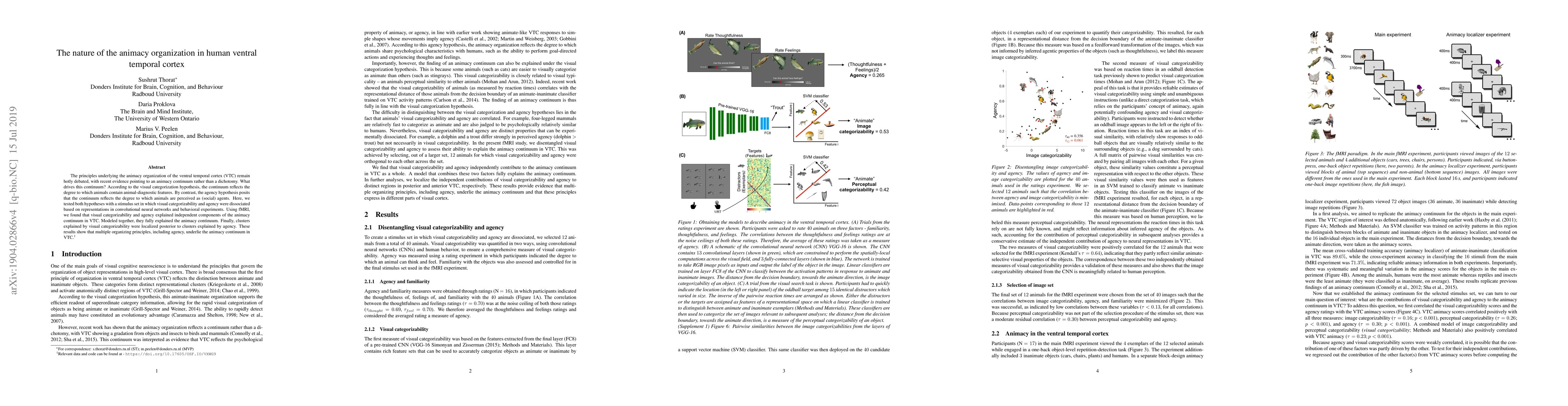 This study investigates the principles behind animacy organization in the human ventral temporal cortex (VTC), finding that both visual categorizability and agency independently contribute to the animacy continuum, with visual features localized posteriorly and agency-related clusters elsewhere.