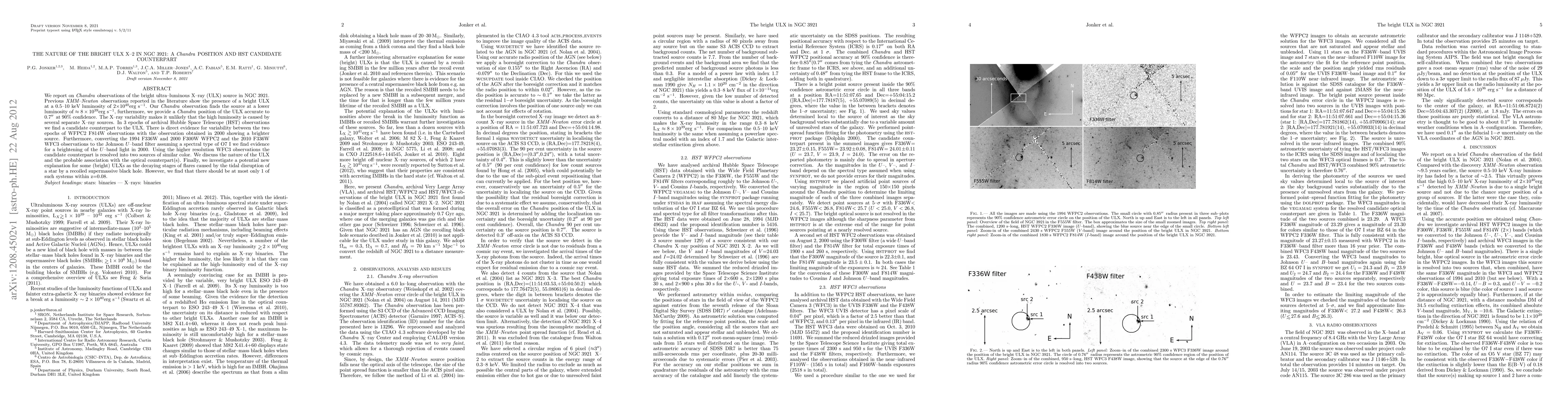 We report on Chandra observations of the bright ultra-luminous X-ray (ULX) source in NGC3921. Previous XMM observations reported in the literature show the presence of a bright ULX at a 0.5-10 keV luminosity of 2x10^40 erg/s. Our Chandra observation finds the source at a lower luminosity of ~8x10^39 erg/s, furthermore, we provide a Chandra position of the ULX accurate to 0.7" at 90% confidence. The X-ray variability makes it unlikely that the high luminosity is caused by several separate X-ray sources. In 3 epochs of archival Hubble Space Telescope (HST) observations we find a candidate counterpart to the ULX. There is direct evidence for variability between the two epochs of WFPC2 F814W observations with the observation obtained in 2000 showing a brighter source. Furthermore, converting the 1994 F336W and 2000 F300W WFPC2 and the 2010 F336W WFC3 observations to the Johnson U-band filter assuming a spectral type of O7I we find evidence for a brightening of the U-band light in 2000. Using the higher resolution WFC3 observations the candidate counterpart is resolved into two sources of similar color. We discuss the nature of the ULX and the probable association with the optical counterpart(s). Finally, we investigate a potential new explanation for some (bright) ULXs as the decaying stages of flares caused by the tidal disruption of a star by a recoiled supermassive black hole. However, we find that there should be at most only 1 of such systems within z=0.08.