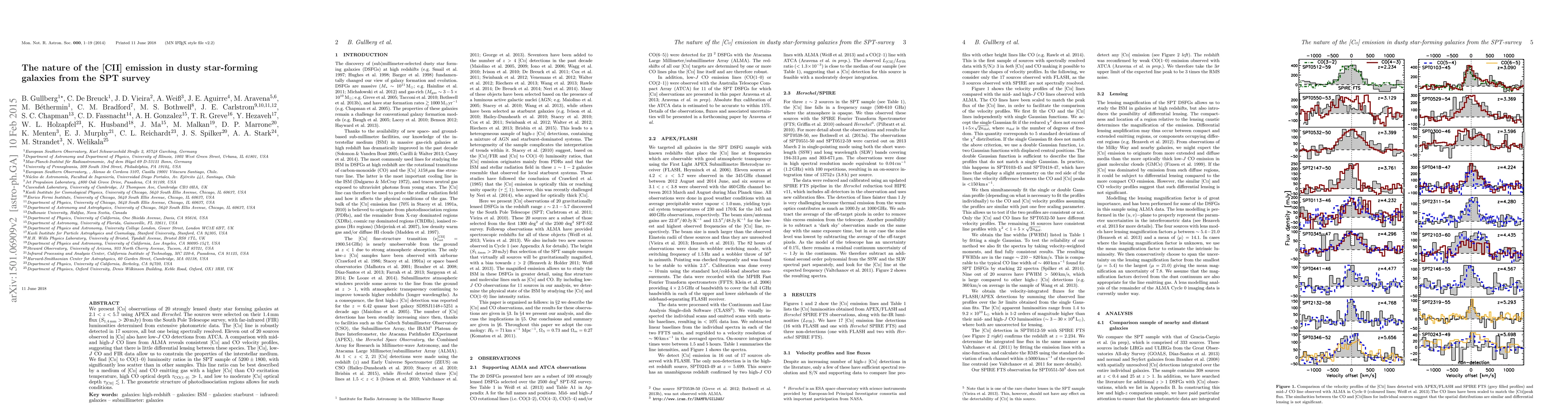 This study uses [CII] observations from APEX and Herschel to analyze 20 strongly lensed, dusty star-forming galaxies selected from the SPT survey. The [CII] line is detected in 17 sources, revealing consistent [CII] and CO velocity profiles, suggesting minimal differential lensing. The [CII] to CO(1-0) luminosity ratio is found to be 5200 ± 1800, indicating a medium with higher [CII] than CO excitation temperature and high CO optical depth.