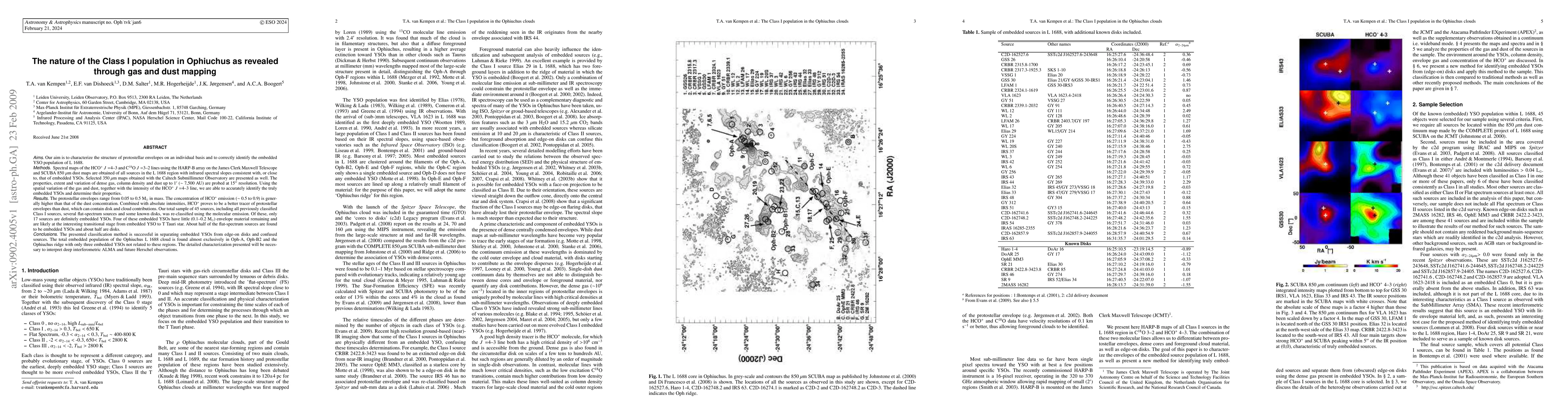 The Ophiuchus clouds, in particular L~1688, are an excellent region to study the embedded phases of star formation, due to the relatively large number of protostars. However, the standard method of finding and characterizing embedded young stellar objects (YSOs) through just their infrared spectral slope does not yield a reliable sample. This may affect the age determinations, often derived from the statistics on the total number of embedded YSOs and pre-main sequence stars within a cloud.Our aim is to characterize the structure of protostellar envelopes on an individual basis and to correctly identify the embedded YSO population of L1688. Spectral maps of the HCO+ J=4--3 and C18O J=3--2 lines using the HARP-B array on the James Clerk Maxwell Telescope and SCUBA 850 micron dust maps are obtained of all sources in the L1688 region with infrared spectral slopes consistent with, or close to, that of embedded YSOs. Selected 350 micron maps obtained with the Caltech Submillimeter Observatory are presented as well. The properties, extent and variation of dense gas, column density and dust on scalesup to 1' are probed at 15" resolution. Using the spatial variation of the gas and dust, together with the intensity of the HCO+ J=4--3 line, we are able to accurately identify the truly embedded YSOs and determine their properties. RESULTS The protostellar envelopes range from 0.05 to 0.5 Msun in mass. The concentration of HCO+ emission (~0.5 to 0.9) is generally higher than that of the dust concentration. Combined with absolute intensities, HCO+ proves to be a better tracer of protostellar envelopes than dust, which can contain disk and cloud contributions. Our total sample of 45 sources, including all previously classified Class I sources, several flat-spectrum sources and some known disks, was re-classified using the ....